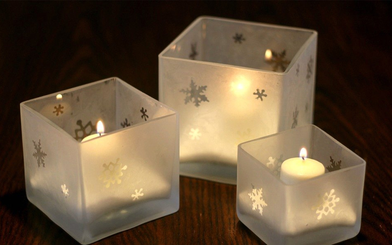 Kada se staklo osuši, tada ćete vidjeti i rezultat. Dobićete zamagljeno (pjeskareno) staklo. Na dno posuda ubacite morsku so, kako biste dobili efekat snijega, a na so stavite svijeće.