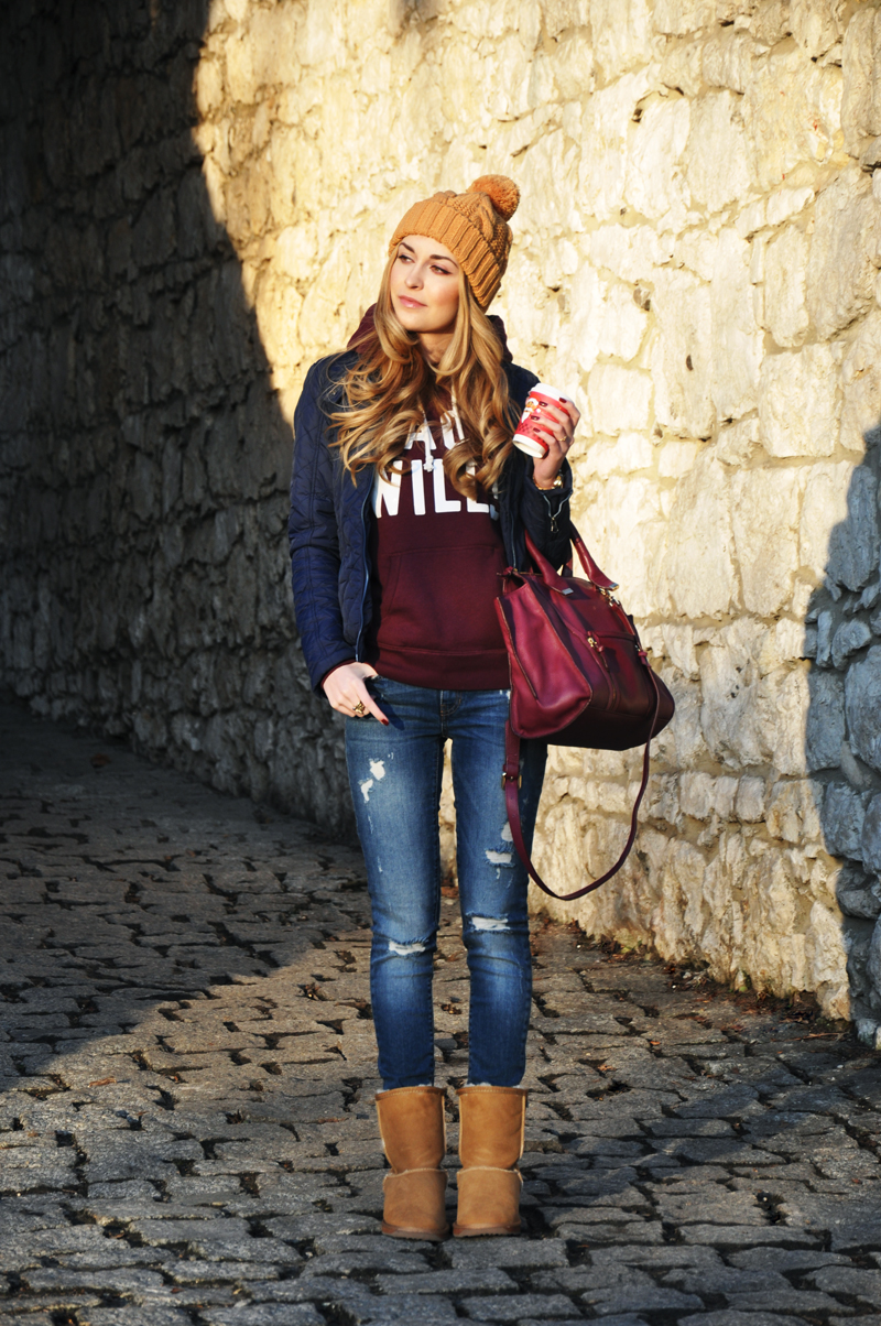 Bordo je i dalje jedna od najmodernijih boja pa nema razloga da je ne nosite. Bordo majicu ili duksericu kombinujte sa farmericama. Što se tiče obuće, ugsice su i dalje jako popularne pa neka one budu vaš odabir za sutra. Jakna će vam svakako biti potrebna, ali i kapa koja je jedan od najljepših modnih detalja ove sezone.