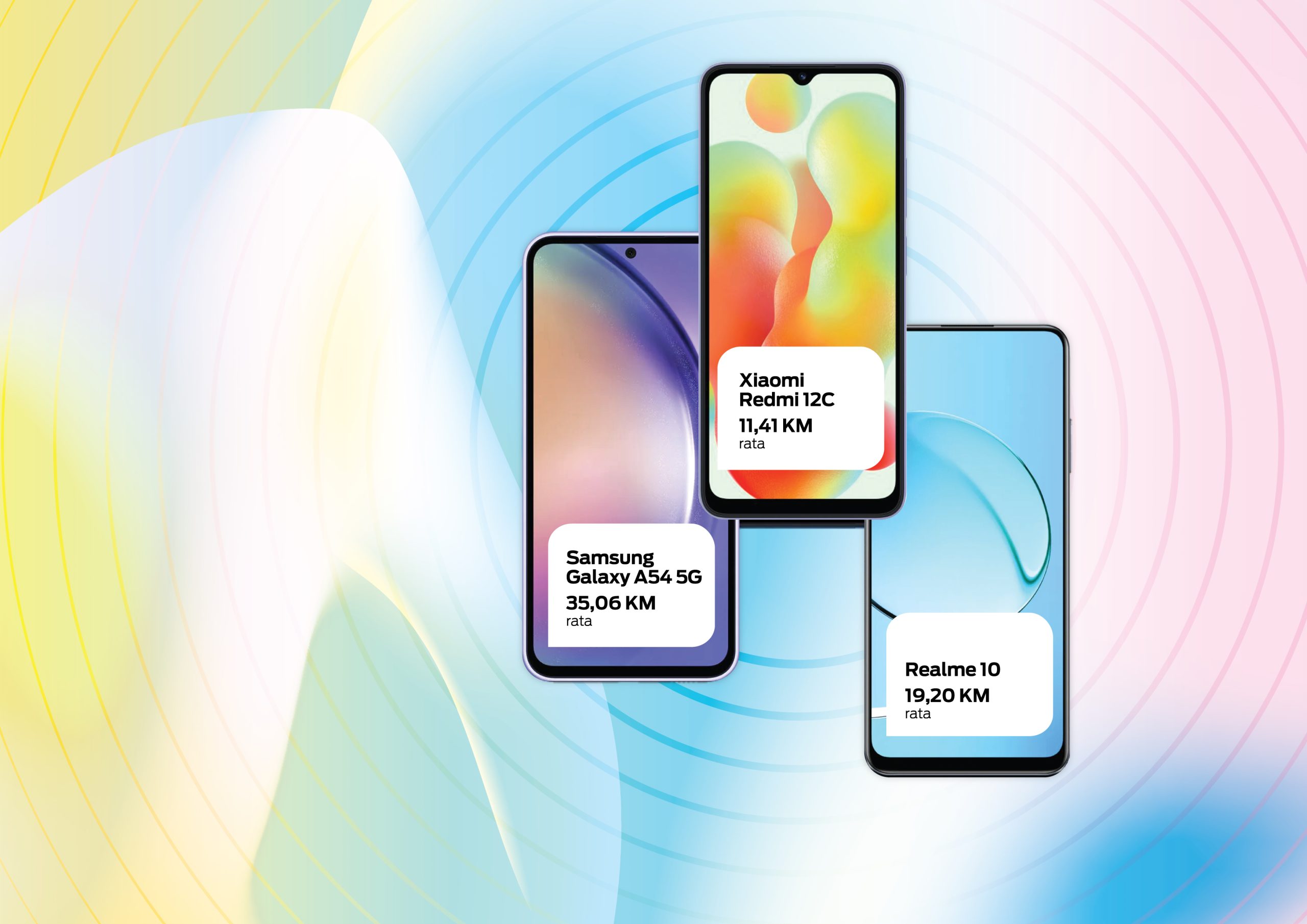 Ovog mjeseca za vas izdvajamo: Xiaomi Redmi 12C 3/64 uz mjesečnu ratu od 11,41 KM, Realme 10 8/128 uz ratu od 19,20 KM i Samsung Galaxy A54 5G 8/128 uz mjesečnu ratu od 35,06 KM.