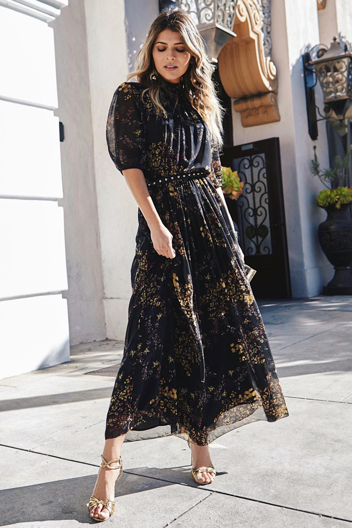 Lepršava, transparentna, crna maksi haljina sa diskretnim dezenom u zlatnoj nijansi, doprinijeće da izgledate veoma graciozno i otmjeno u svim svečanim trenucima. Model i nijansa haljine vizuelno će figuru učiniti višom i vitkijom, a bogatstvo kroja i materijala zahtijevaju minimalne modne dodatke u neutralnoj nijansi (crne ili nijansa dezena).