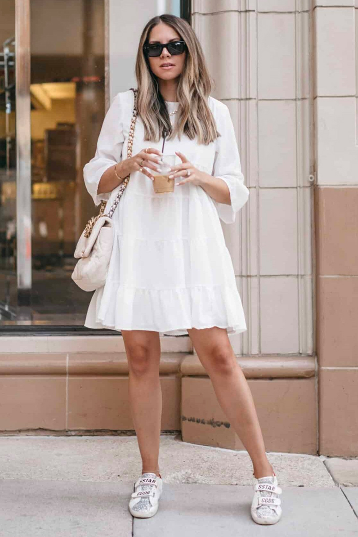 Jedan od načina na koji možete nositi udobnu bijelu haljinu je i kombinacija sa vašim omiljenim patikama. Kombinacija u kojoj će ljetne šetnje biti pravi užitak pristaje svim generacijama, dok su modni dodaci, poput torbe ravnih linija, šik detalji koji će upotpuniti sportsko-elegantni stil koji odiše ležernošću.