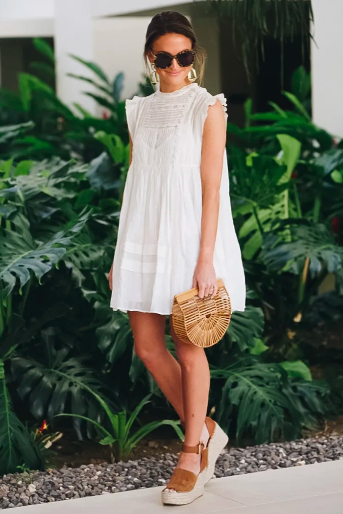 Ležeran kroj bijele mini haljine model je koji ljeti možete nositi u svim neformalnim prilikama. Diskretni detalji poput veza, diskretnog cvjetnog dezena ili pak rupičasti materijal, učiniće model haljine bogatijim i privlačnijim. Za maksimalnu udobnost kombinujte je uz ravne sandale na vezivanje, a koje će definitivno dodati dozu šarma kompletnoj kombinaciji.