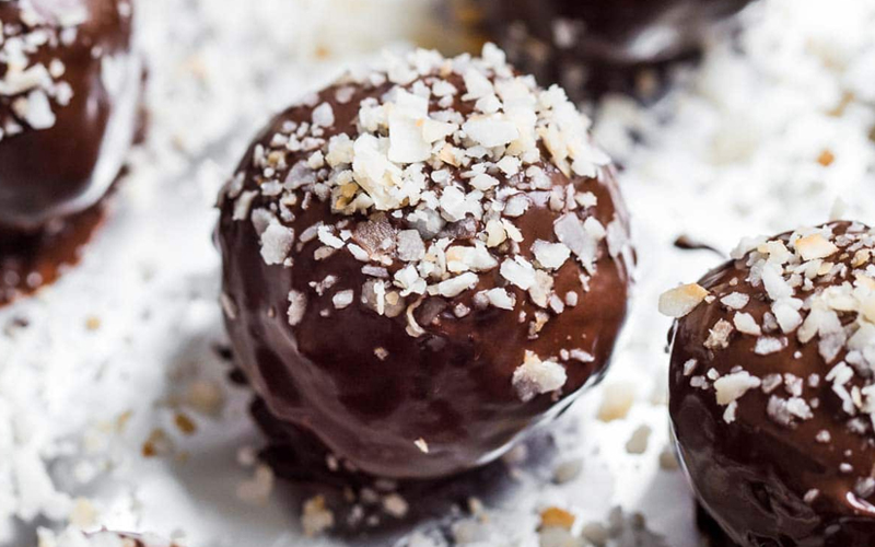 Ako želite da “začinite” recept, formirane kuglice (bez valjanja u kokos) ostavite u frižider da prenoće. Ujutro istopite tamnu čokoladu na pari pa svaku kuglicu umočite u čokoladu i pospite kokosom. Vratite u frižider da se stegnu.