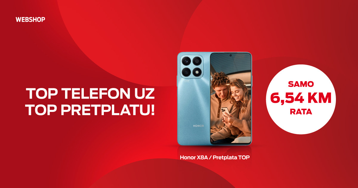 Naručite Honor X8a ili Redmi Note 12 po sniženoj cijeni, na rate i sa besplatnom dostavom do kućnog praga! Uz ove modele izaberite Top tarifu i uživajte u fantastičnom mjesečnom bonusu za mobilni net!