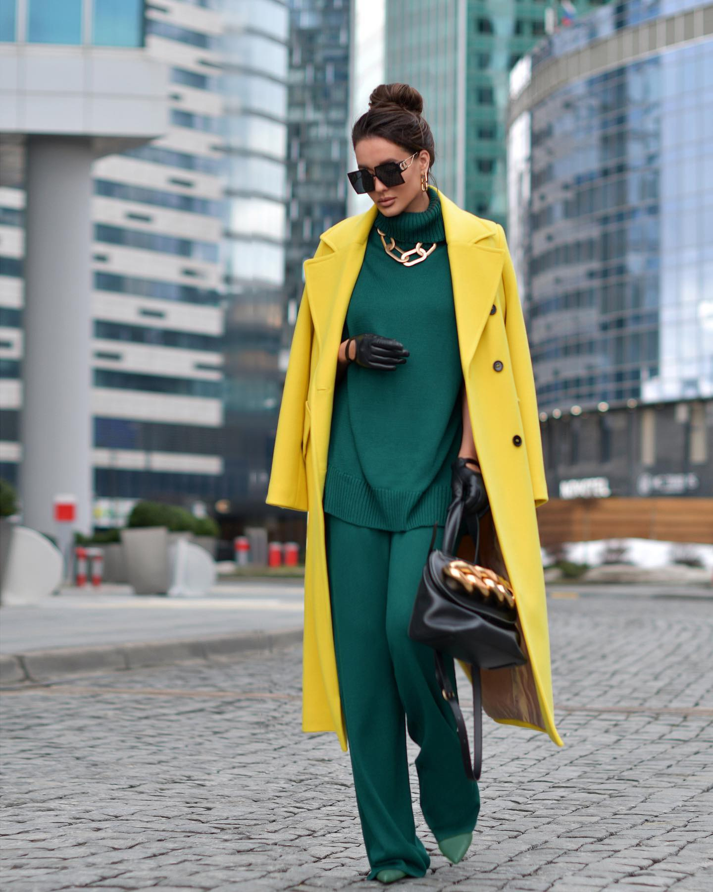 Tamno zelena u zimskim kombinacijama djeluje ozbiljno, stabilno i elegantno, a ujedno je odlična alternativa crnoj ili tamno plavoj. Ima dovoljno težine da se uklopi u hladnije mjesece, ali i dovoljno karaktera da izgleda zanimljivo i moderno. Kada se spoji sa žutom, dobija potpuno novu dimenziju – žuta razbija zatvorenost tamno zelene i unosi energiju, svjetlost i dozu hrabrosti u cijeli stajling.
