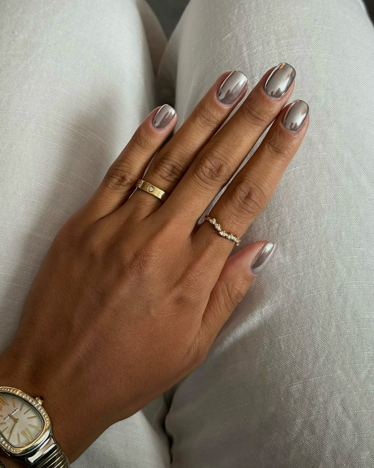 Ova varijanta daje srebreni metalik sjaj koji izgleda glatko i ujednačeno, kao da je boja blago „istopljena“ preko nokta. Efekat je sjajan i prodoran, ali mek u završnici pa manikir izgleda moderno i upadljivo, bez grubih prelaza.