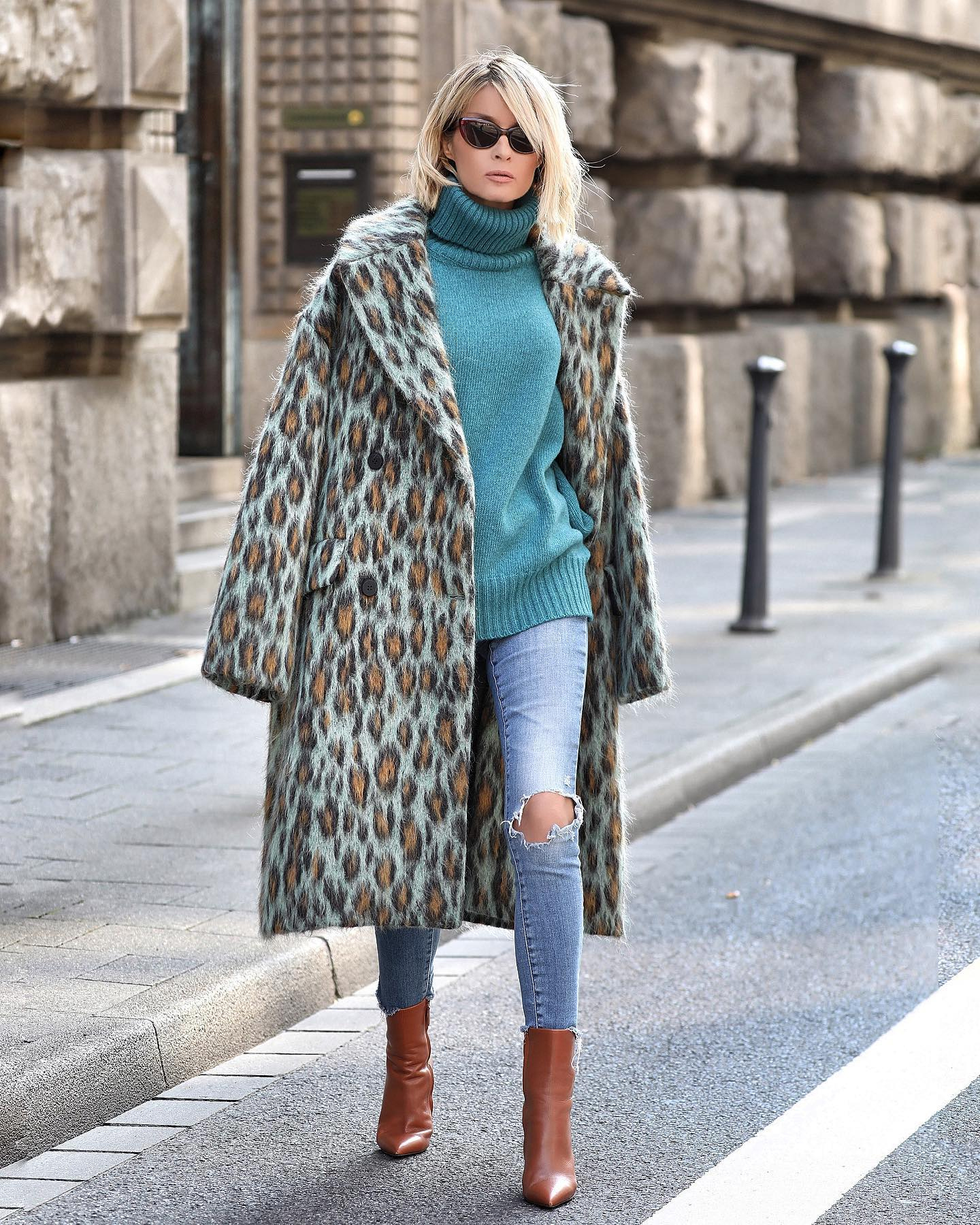 Leopard uzorak ovdje preuzima glavnu ulogu, ali bez agresije – djeluje moderno, urbano i vrlo nosivo. Uparen s hladnijom nijansom ispod, cijeli izgled dobija ravnotežu koja ga izvlači iz klasičnih okvira i daje mu svjež, savremen karakter. Sve izgleda kao prirodan izbor, a ne pokušaj da se privuče pažnja.