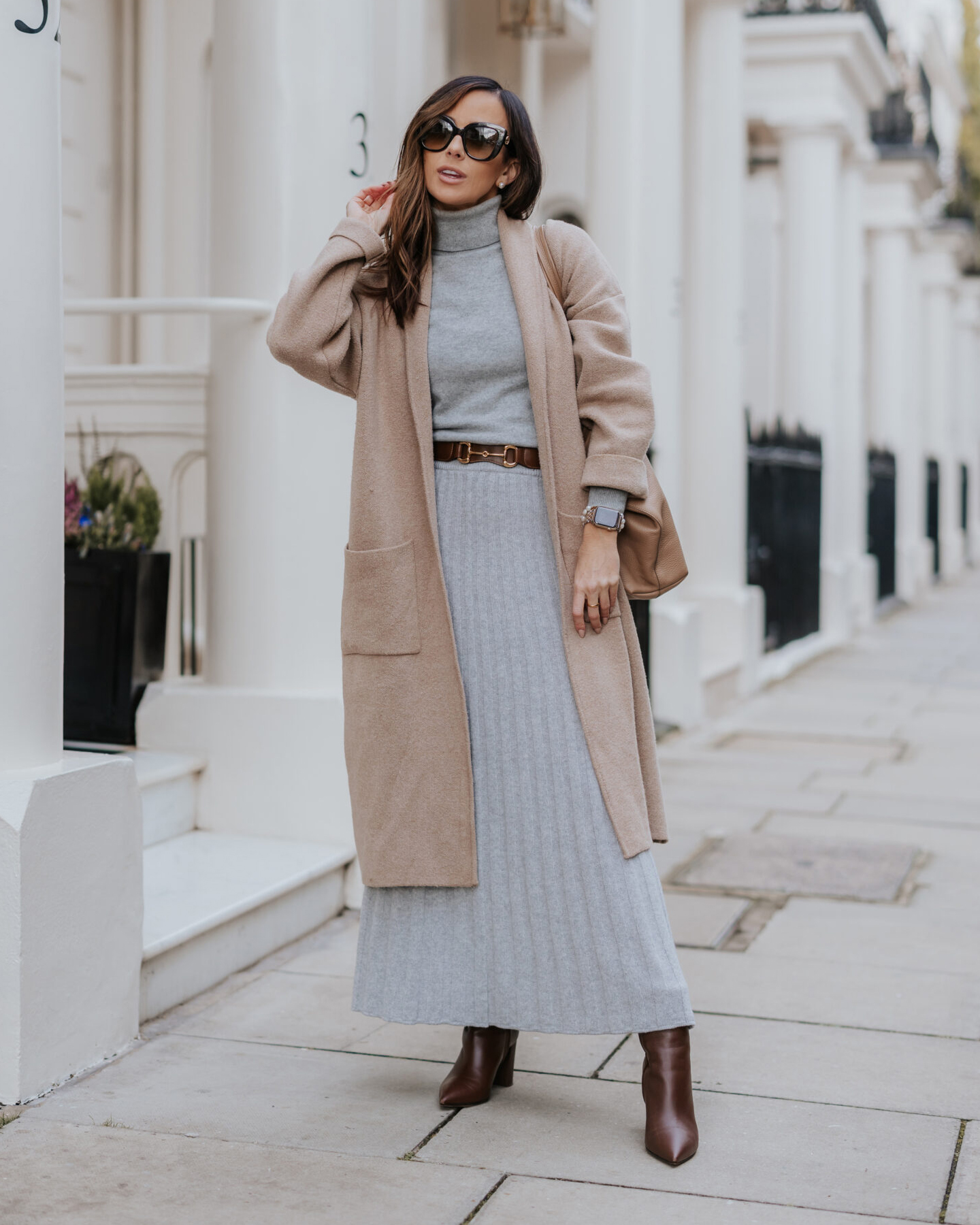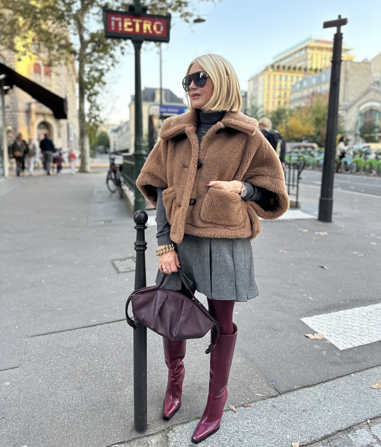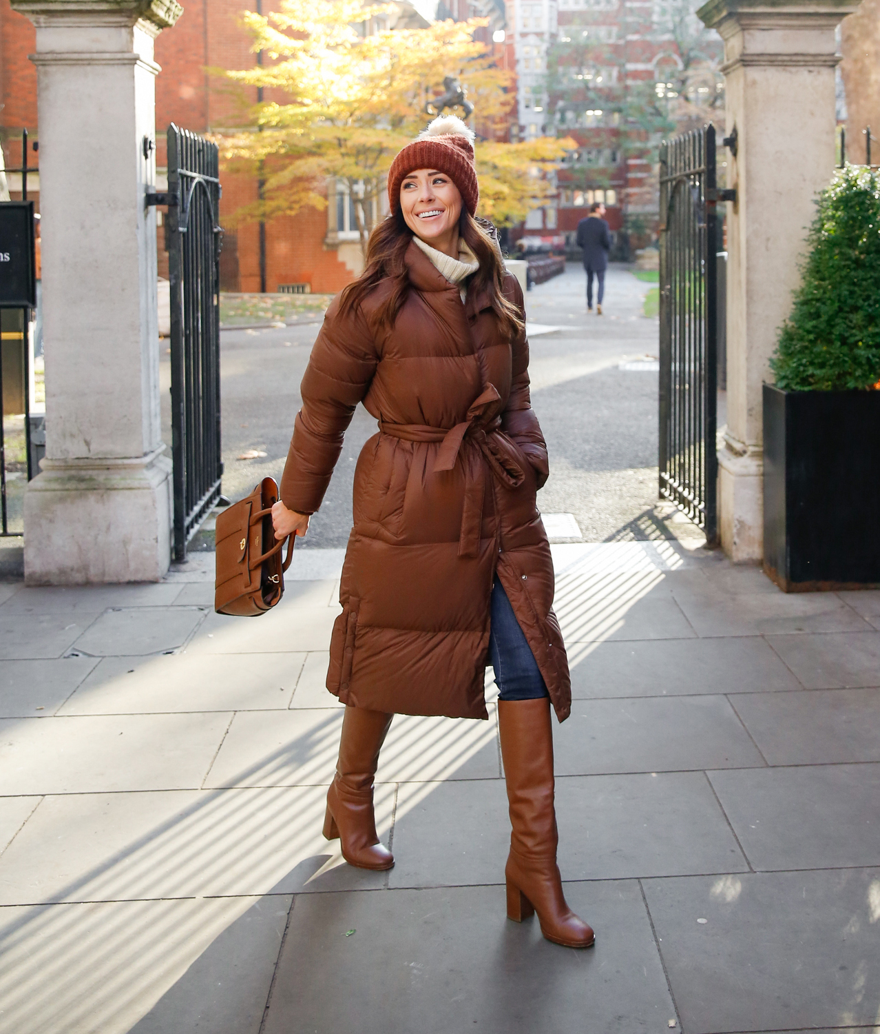 Topli slojevi ovdje se susreću s urbanom preciznošću i stvaraju izgled koji djeluje istovremeno udobno i vrlo promišljeno. Kratka silueta u bogatoj smeđoj nijansi donosi osjećaj mekoće i zaštite, dok sivi tonovi ispod nje smiruju cijelu priču i drže je u okvirima gradske svakodnevice.