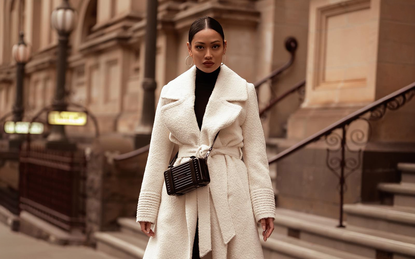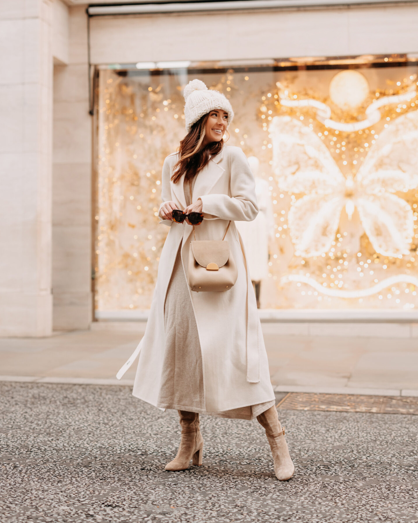 Svijetli tonovi ovdje stvaraju osjećaj topline i lakoće, čak i u zimskom ambijentu. Cijeli izgled djeluje nježno i smireno, kao mali predah od tamnih boja koje obično dominiraju hladnijim danima. Sve je povezano u istom kolorističkom smjeru pa silueta izgleda čisto, produženo i vrlo skladno.