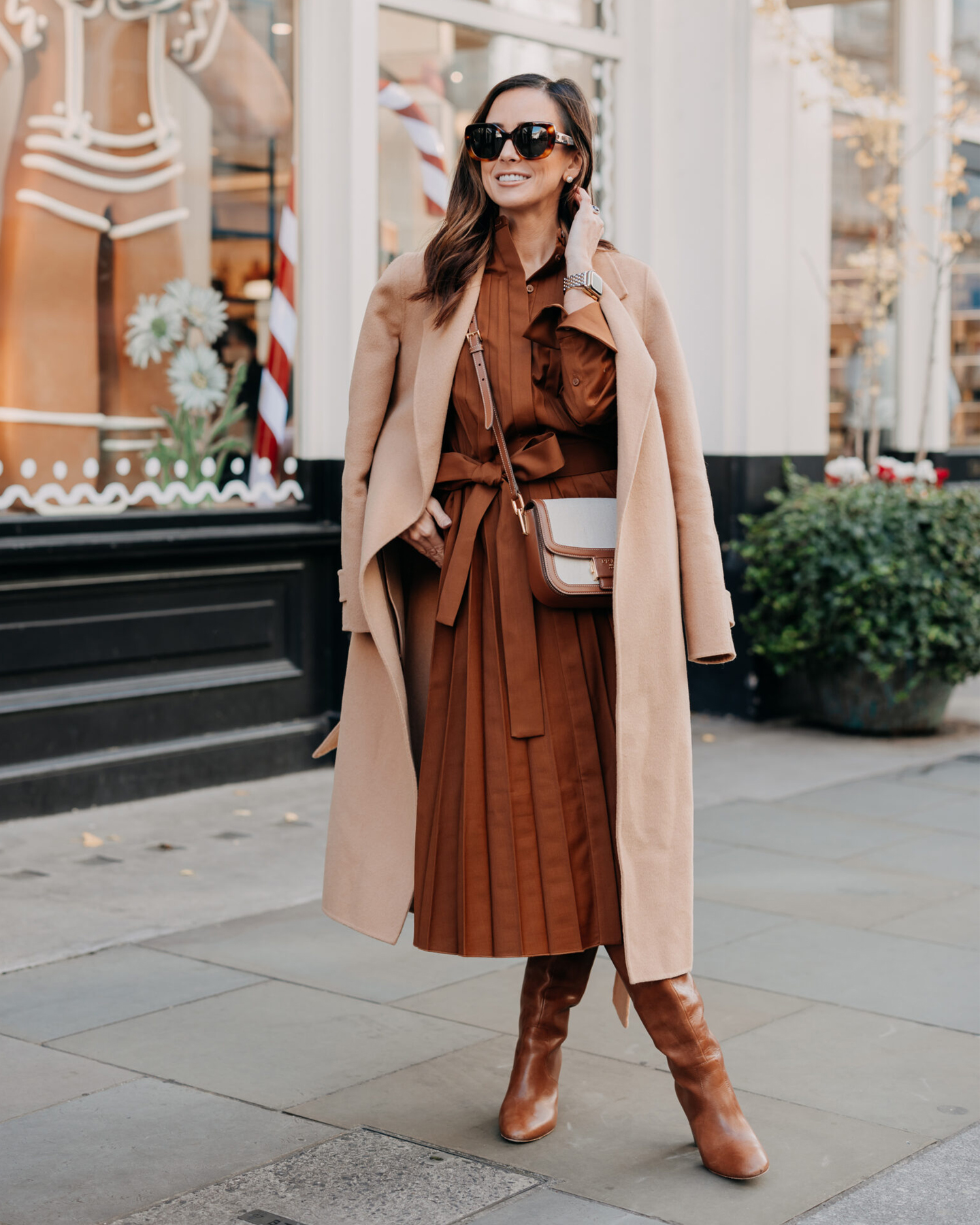 Plisirana haljina unosi ritam i dinamiku u siluetu, a vezivanje u struku dodatno naglašava formu bez potrebe za oštrim kontrastima. Sve teče u istom kolorističkom smjeru pa cijeli izgled djeluje zaokruženo i prirodno, kao kombinacija koja se nosi s lakoćom i sigurnošću.