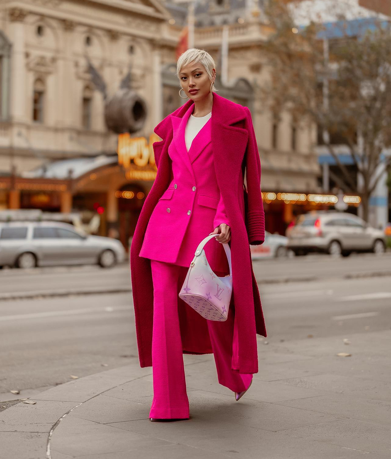 Intenzivna ružičasta ovdje preuzima potpunu kontrolu nad izgledom i ne ostavlja prostor za kompromis. Boja djeluje snažno, samouvjereno i vrlo svjesno izabrano, kao jasna odluka da stil bude u prvom planu. Silueta je izdužena i čista, s naglaskom na liniju tijela i kretanje pa cijeli utisak ostaje elegantan, ali nimalo krut.