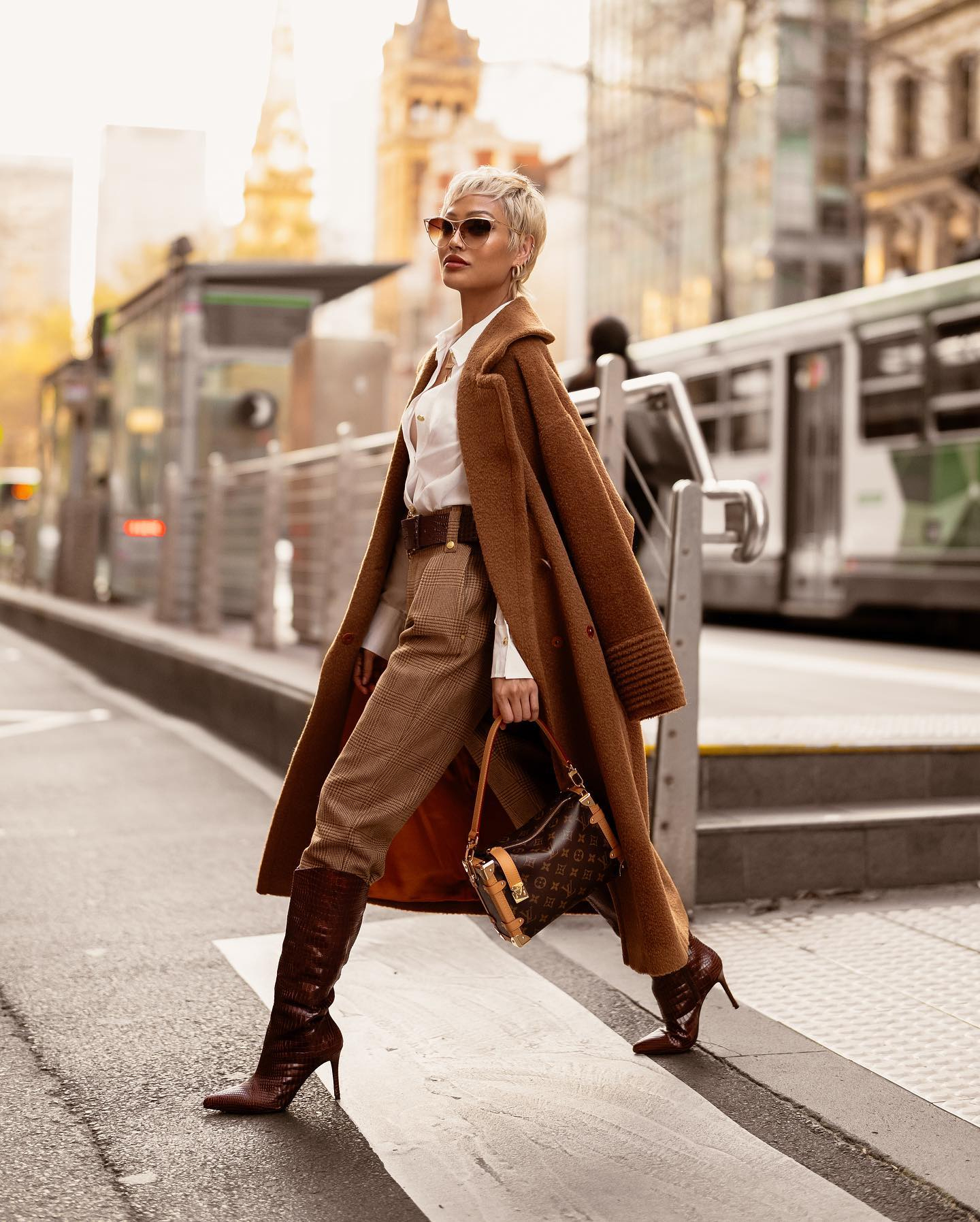 Ova kombinacija djeluje kao snažan gradski trenutak uhvaćen u pokretu. Sve je podređeno dinamici – korak je dug, silueta izdužena, a cijeli izgled odiše samopouzdanjem koje ne traži objašnjenje. Topli tonovi nose glavnu priču i stvaraju osjećaj kontinuiteta s urbanim okruženjem, dok klasični elementi dobijaju savremenu, oštriju interpretaciju.