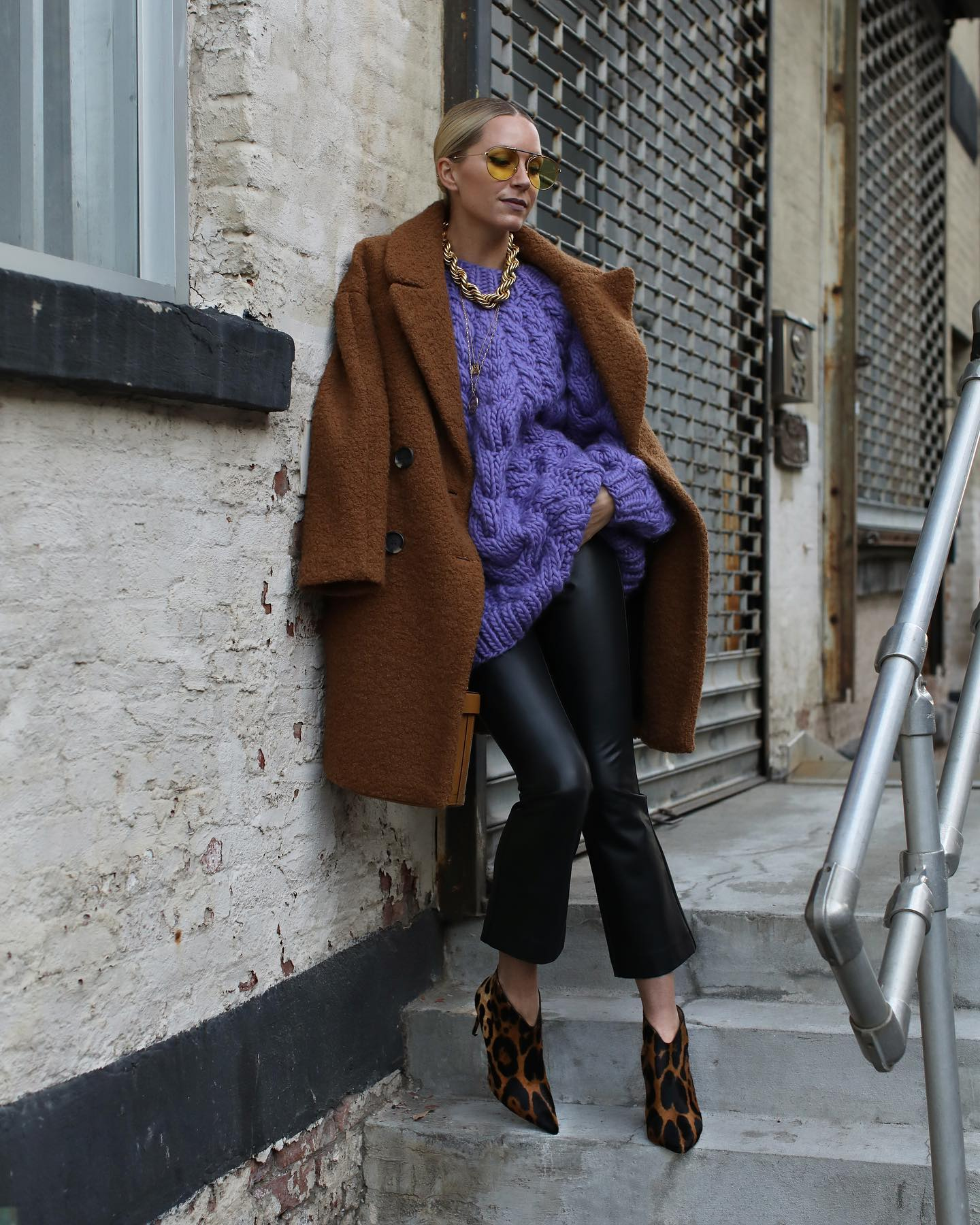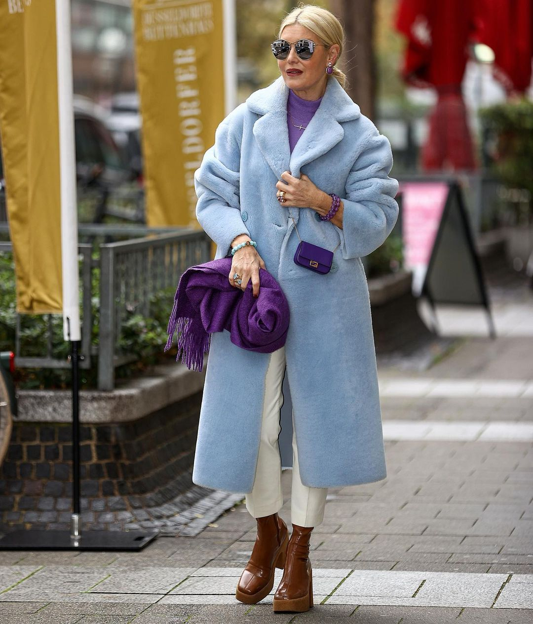 Ovaj stajling odiše sigurnošću i jasnim osjećajem za boju, bez ikakve potrebe da se uklapa u očekivane okvire. Nježna plava nijansa kaputa djeluje smireno i osvježavajuće, ali tek u kombinaciji s bogatim ljubičastim tonovima dobija punu snagu. Umjesto klasične neutralnosti, ovdje se bira igra kontrasta koja izgleda promišljeno, ali ne i strogo.