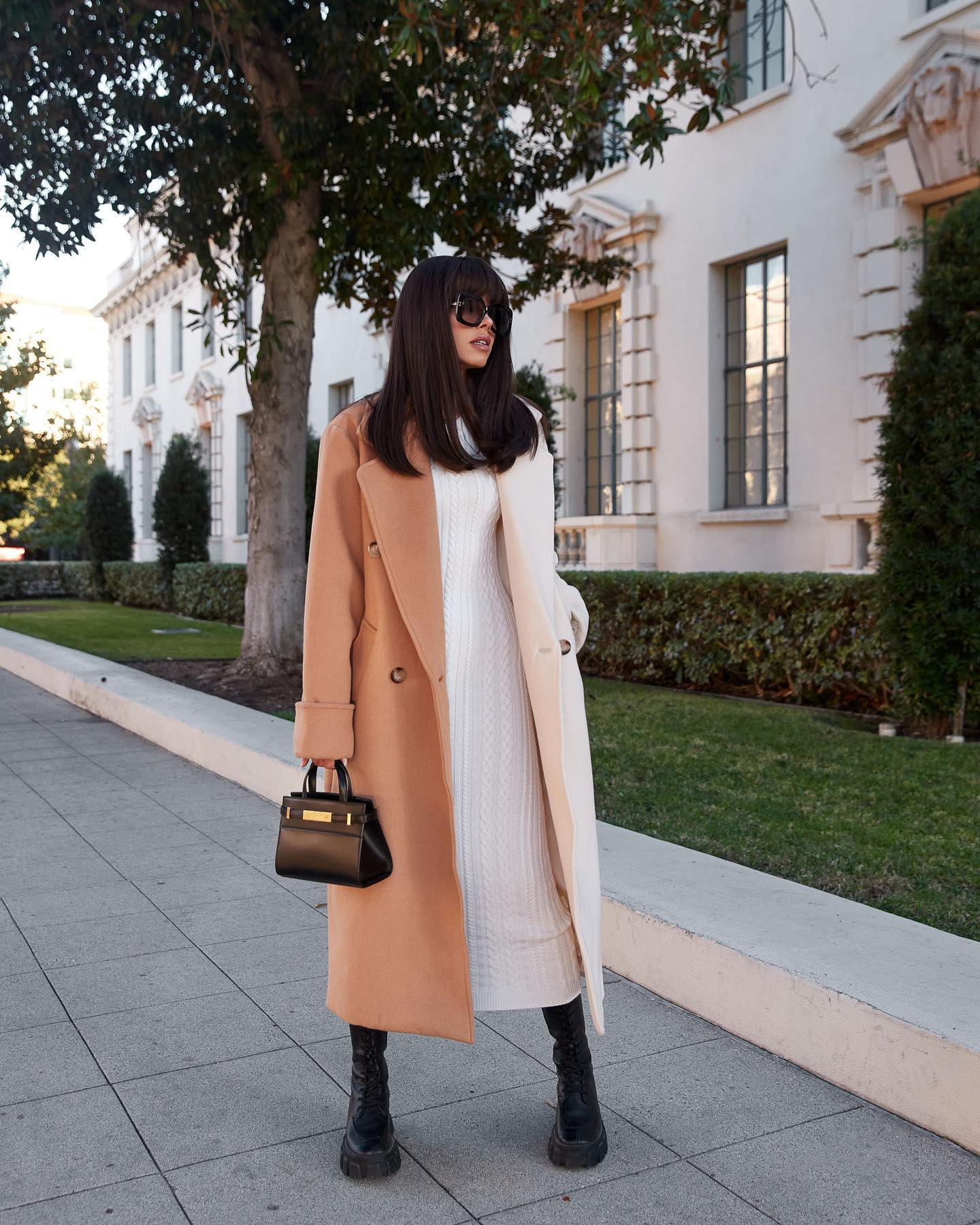 Ova kombinacija gradi priču na kontrastu topline i čistoće, ali bez ijednog naglog poteza. Dvobojni kaput djeluje kao vizuelna linija razdvajanja između klasičnog i savremenog – s jedne strane mek i topao, s druge svijetao i smiren. Taj susret boja izgleda prirodno, kao da je zamišljen da prati pokret i ritam grada.