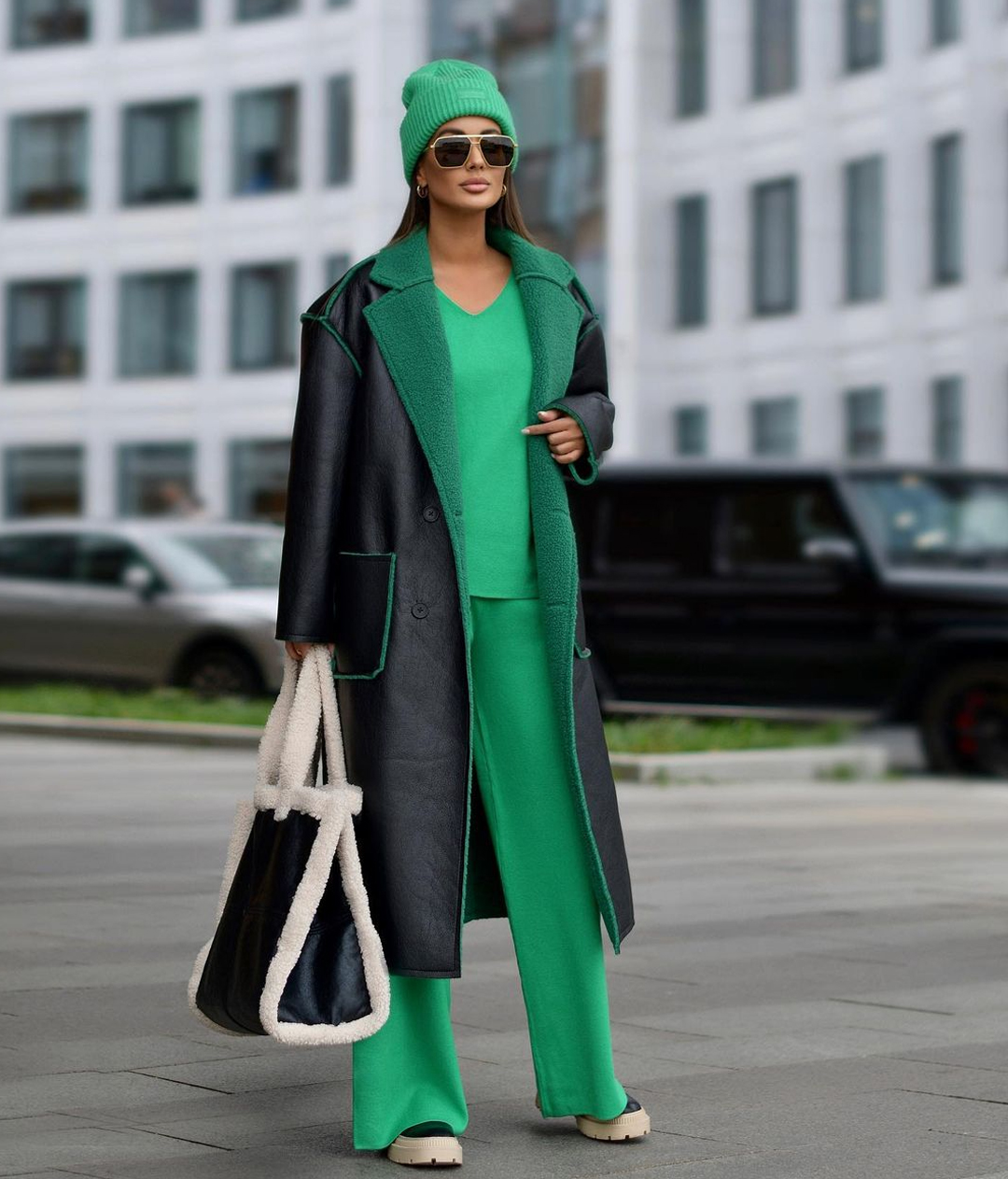Zelena ovdje nastupa kao glavni nosilac raspoloženja – snažna, samouvjerena i potpuno urbana. Ton je energičan, ali ne napadan pa cijeli izgled djeluje moderno i svježe, kao jasna odluka da se boja stavi u prvi plan bez kompromisa. Monohromatski pristup dodatno pojačava utisak sigurnosti i stila koji ne traži dodatna objašnjenja.