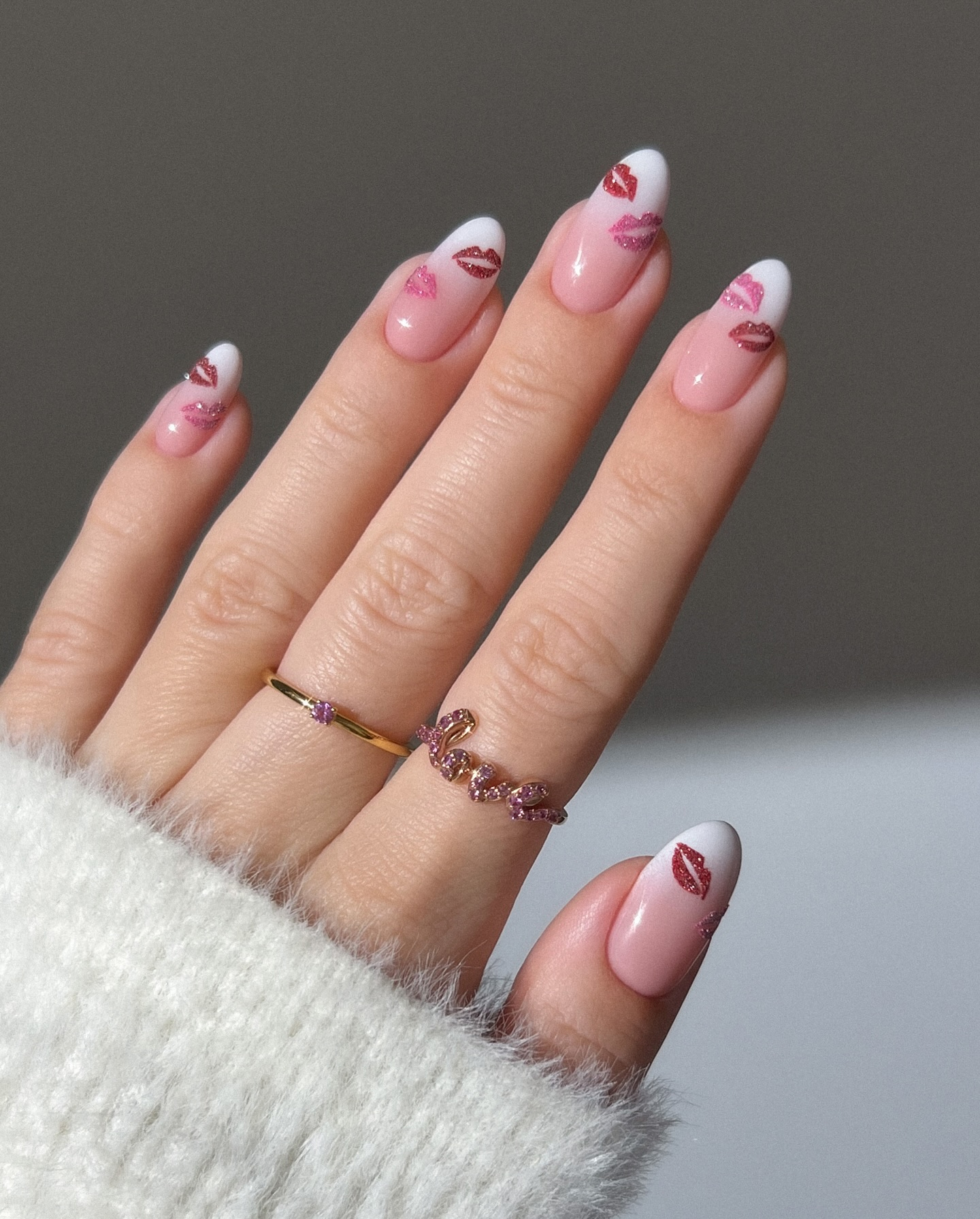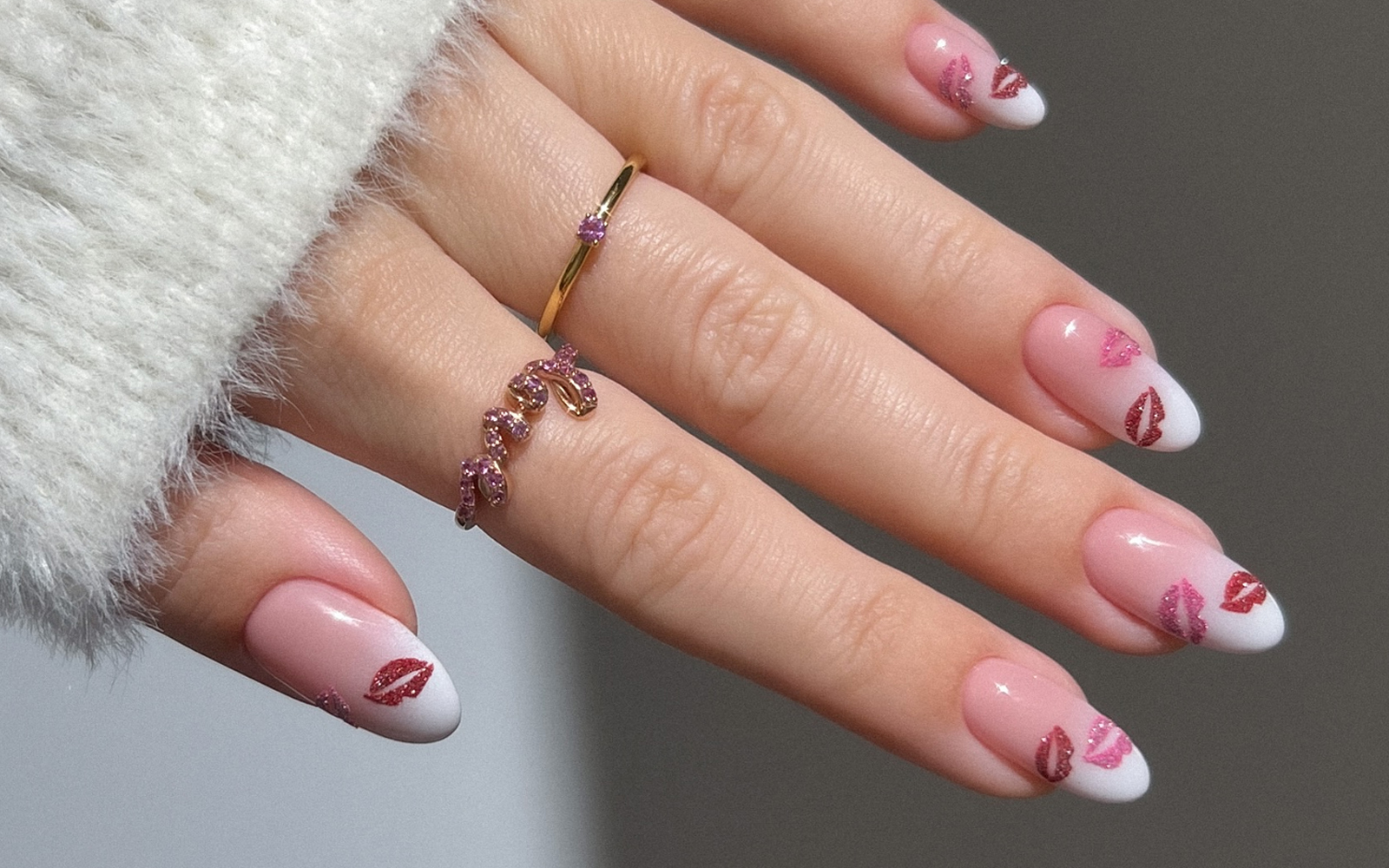 Evo zabavnog načina da se uklopi duh Valentinova. Počinje se s mliječno bijelom podlogom, a zatim se dodaju jarki crveni detalji u obliku srca, usana, francuskog manikira ili pruga.