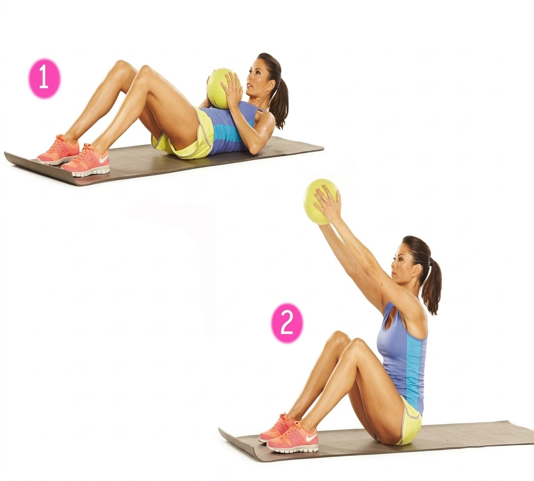 - Kako se izvodi: Lezite na leđa sa savijenim koljenima. Držite teg (ili medicinsku loptu) ispred grudi. Dok se podižete u sjedeći položaj, snažno gurnite teg ispred sebe dok ruke ne budu potpuno zategnute.