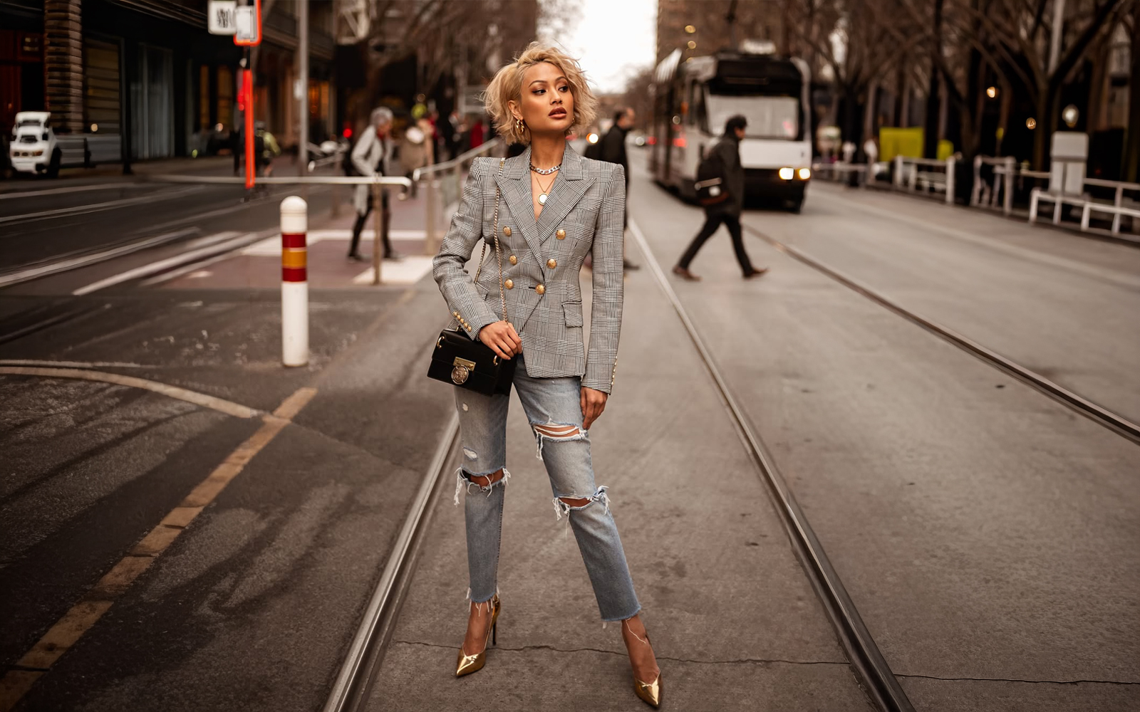 Ukoliko vam je cilj da dobijete veoma urban stil, crne iscijepane farmerice kombinujte sa crnim štiklama. Ovdje dodajte i majicu na bretele koja je ukrašena čipkom i crni blejzer ili jaknu od antilopa. Na kraju, elegantna torba ravnih linija biće kec na desetku.