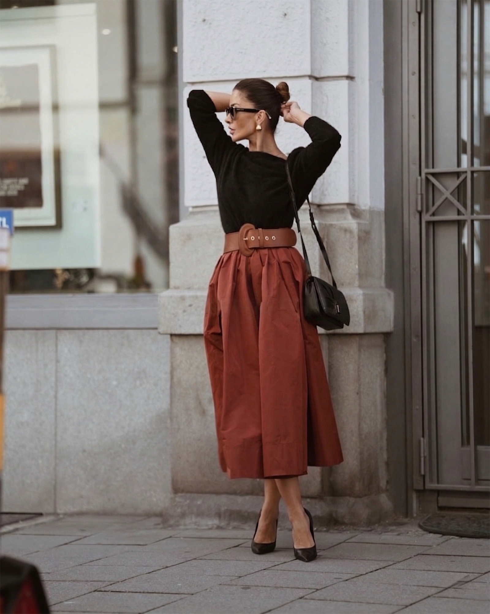 Jednostavan, a nevjerovatno moćan, široki kaiš je najbolji alat za drastičnu promjenu siluete. Baš kao što vidite na slici, on pravi čuda kada se stavi preko jednostavnog, tankog džempera i suknje visokog struka. Njegova širina ga čini idealnim za “kroćenje” kabastije odjeće, poput dugih jakni ili sakoa, dajući vam figuru pješčanog sata u sekundi.