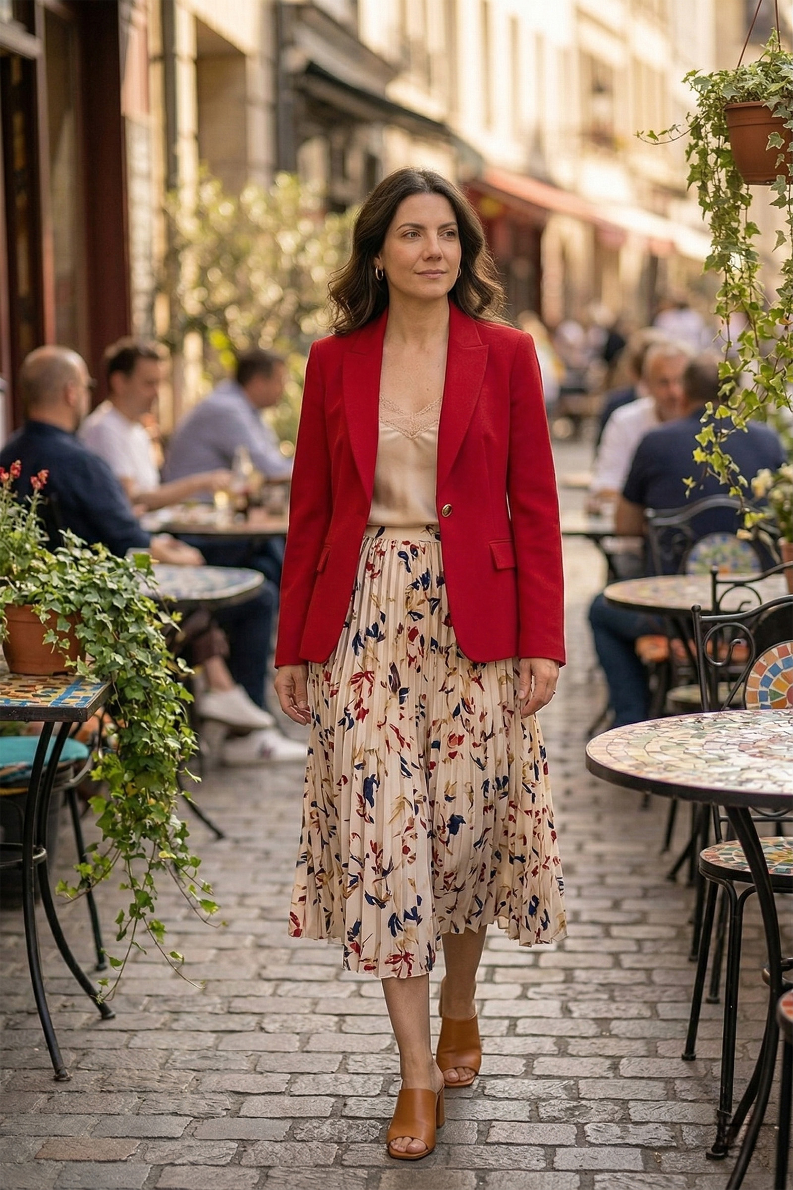 - Opušteni izlazak: Uparite blejzer sa lepršavom, plisiranom suknjom zanimljivog uzorka. Neka se boje na suknji diskretno podudaraju sa crvenom bojom blejzera za skladan izgled.