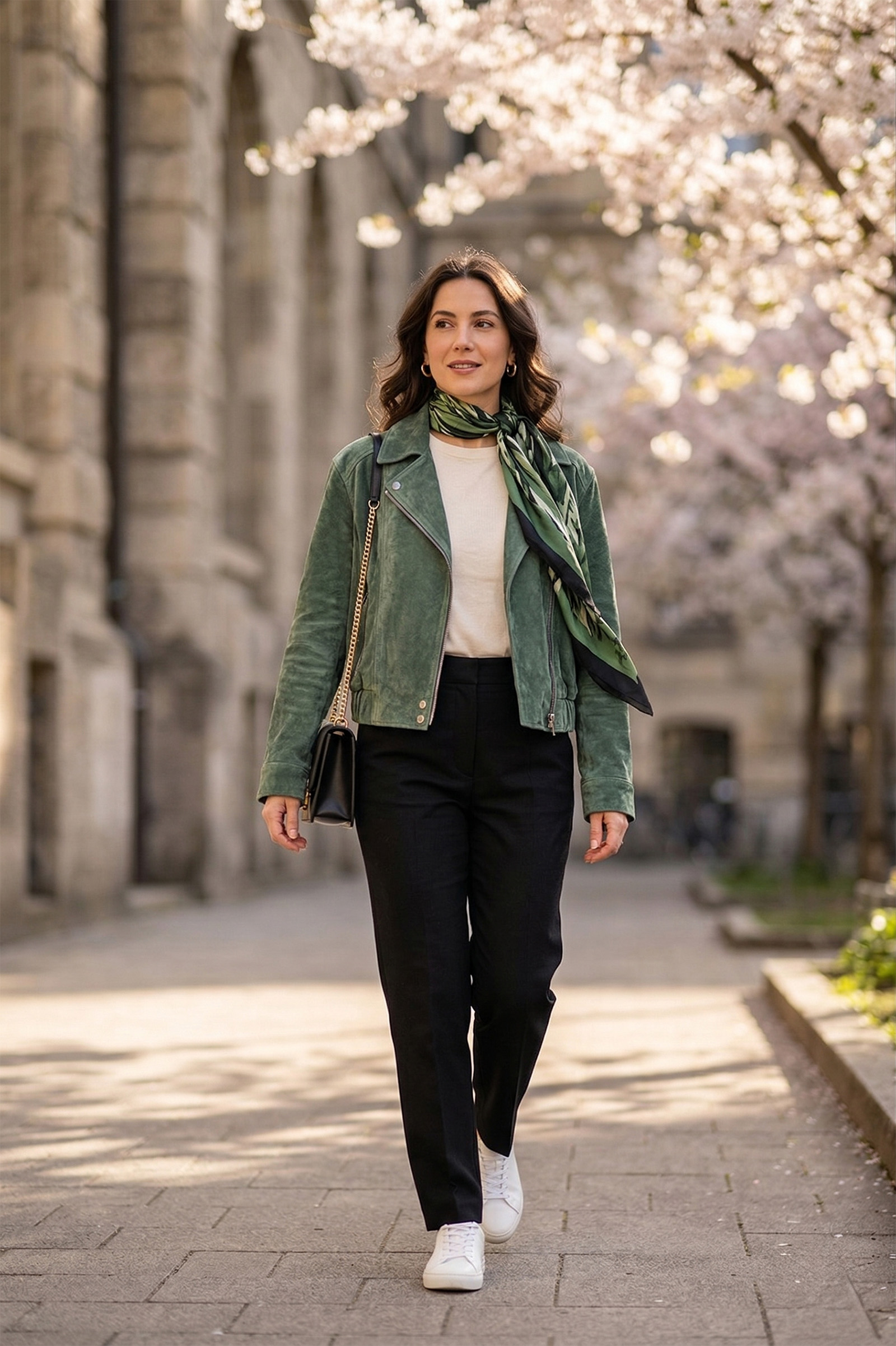 - Za posao: Odlično se slaže uz crne hlače visokog struka i svilenu maramu koja prati zelene tonove jakne.