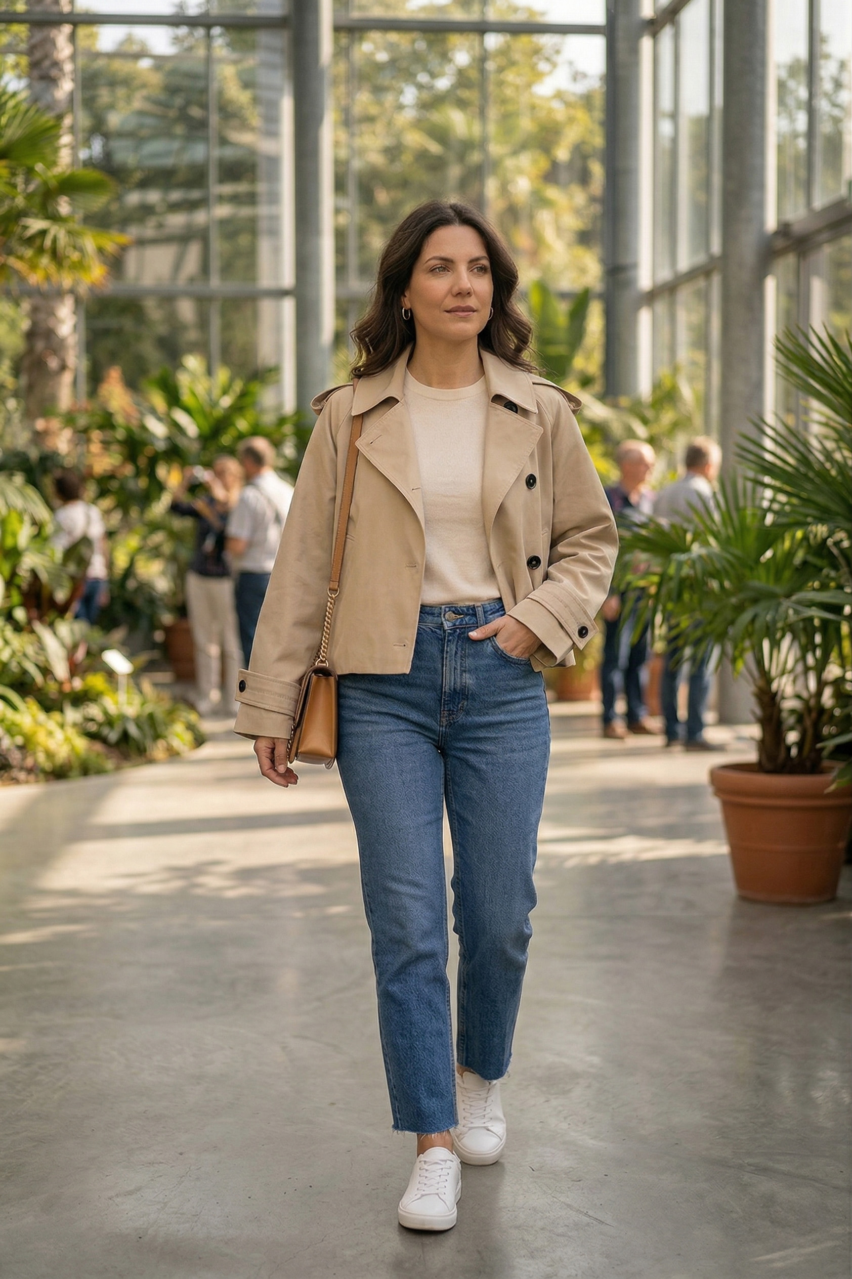 - Svakodnevna šetnja: Spojite ga sa klasičnim plavim farmerkama ravnog kroja i običnom bijelom pamučnom majicom. Ovo je izgled koji nikada ne izlazi iz mode, a odiše nenametljivošću.