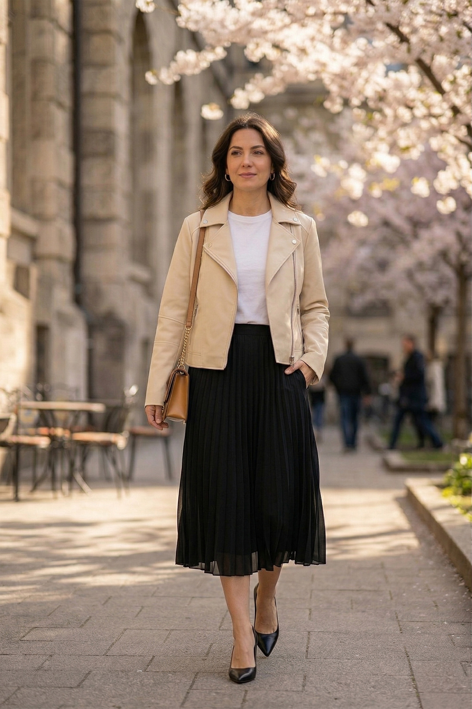 - Detalji: Jednostavna bijela majica ispod jakne održaće izgled čistim i svježim, dok će mala torba sa lancem dodati završni sjaj.