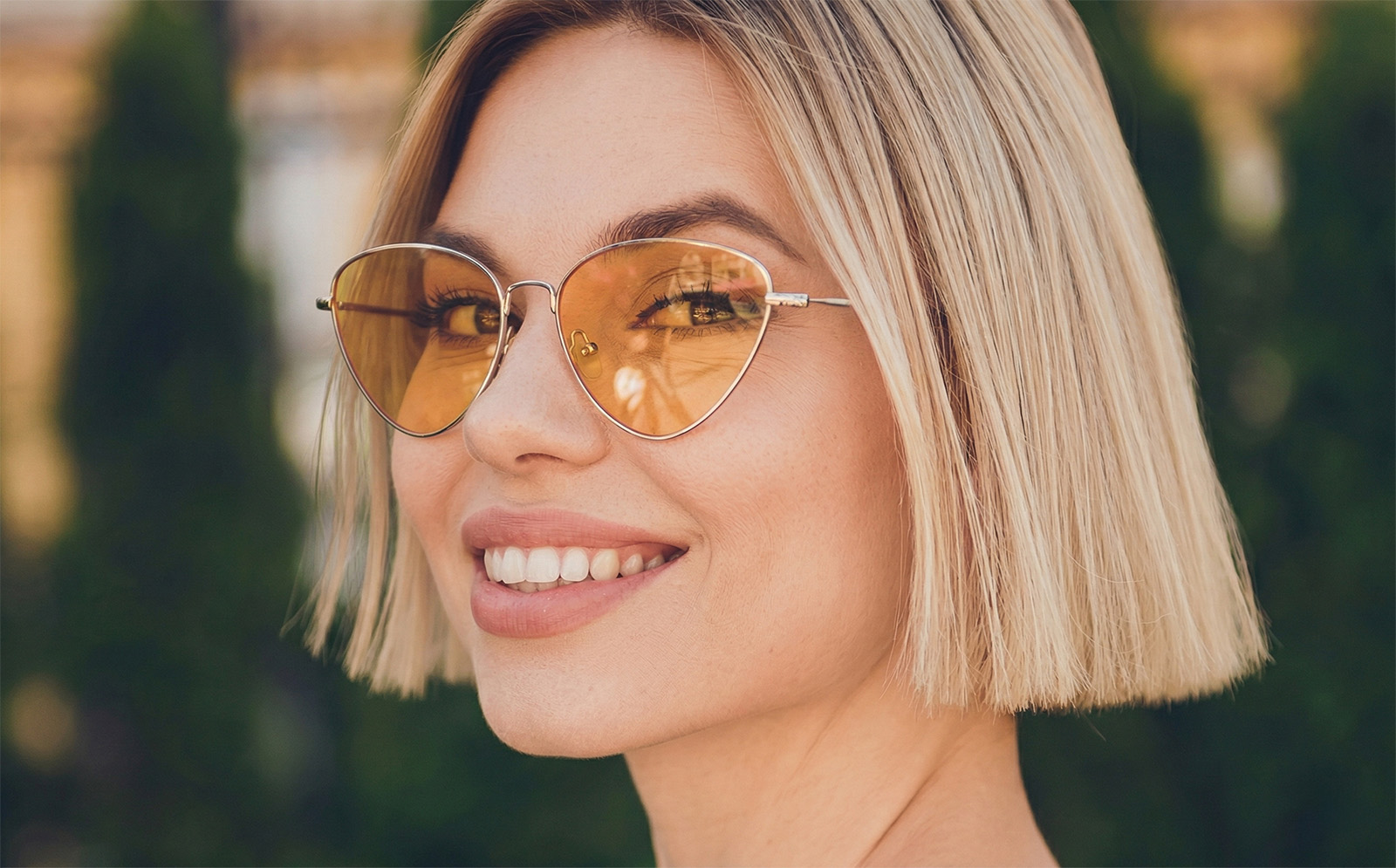 Nasmijana žena sa modernom plavom paž frizurom i sjajnom dlakom nakon pravilne njege kose.