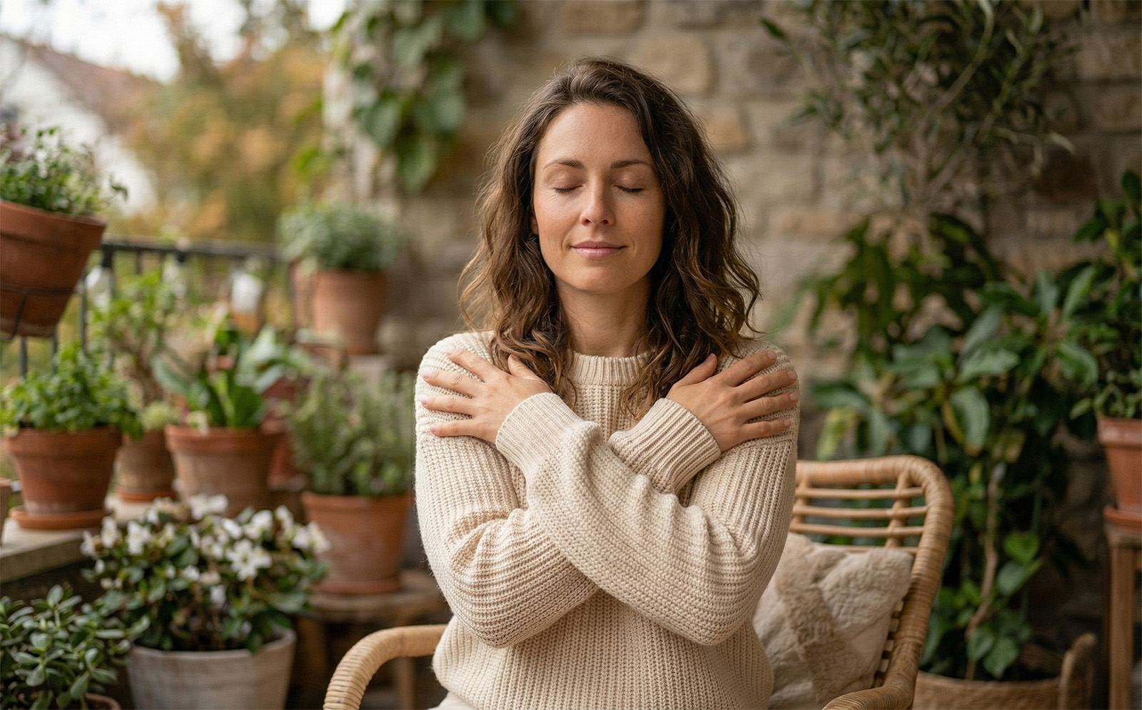 Ova tehnika pruža neobičan osjećaj utjehe, gotovo kao pravi zagrljaj koji dolazi iznutra. Prekrstite ruke preko grudi, tako da vrhovi srednjih prstiju svake ruke budu smješteni odmah ispod ključne kosti suprotne strane (ili na nadlakticama, kako vam je udobnije). Možete raširiti ostale prste poput krila, a palčeve ispreplesti kako biste formirali tijelo leptira.