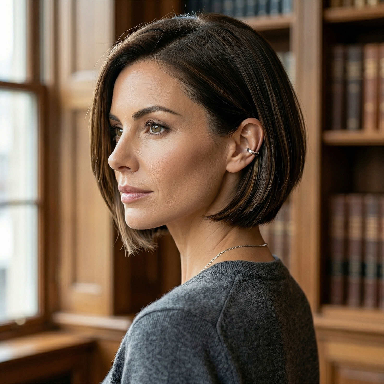 Ovakav način oblikovanja vizuelno izdužuje vrat i naglašava profil, dajući kosi modernu strukturu koja se lako održava feniranjem. Frizura je postojana, ozbiljna, ali i dalje veoma ženstvena.