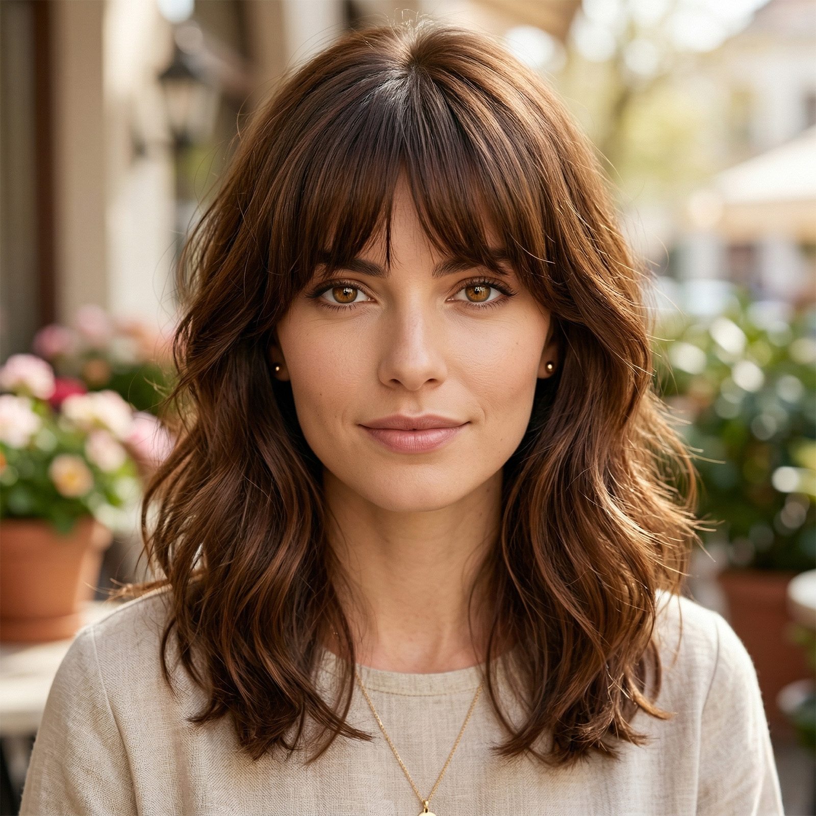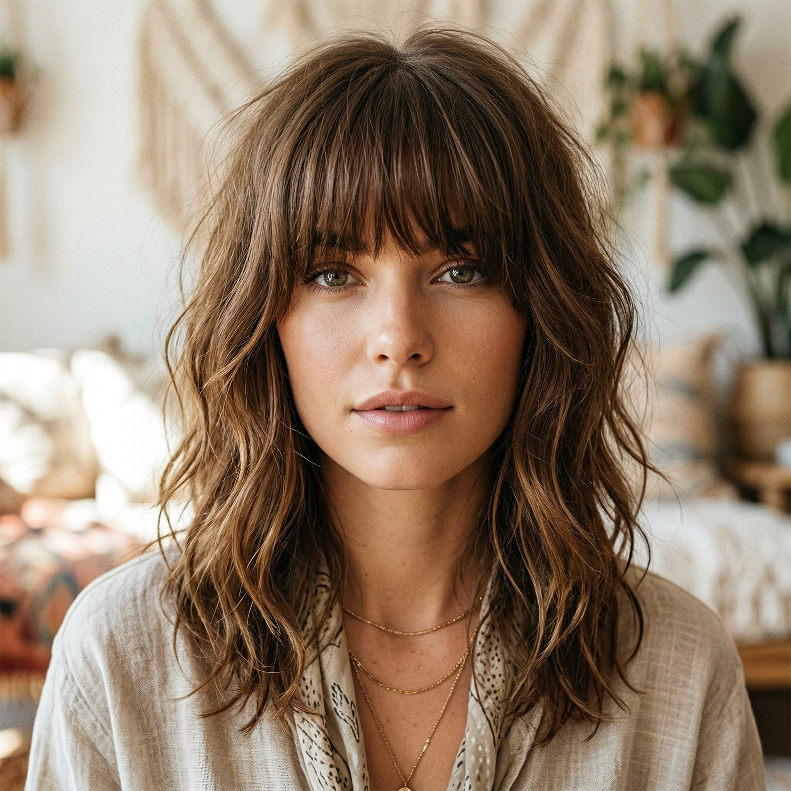 Ako volite neobavezan, pomalo boemski izgled, ovo je frizura za vas. Stepenasto šišanje srednje dužine upotpunjeno je gustim šiškama koje dosežu skoro do trepavica.