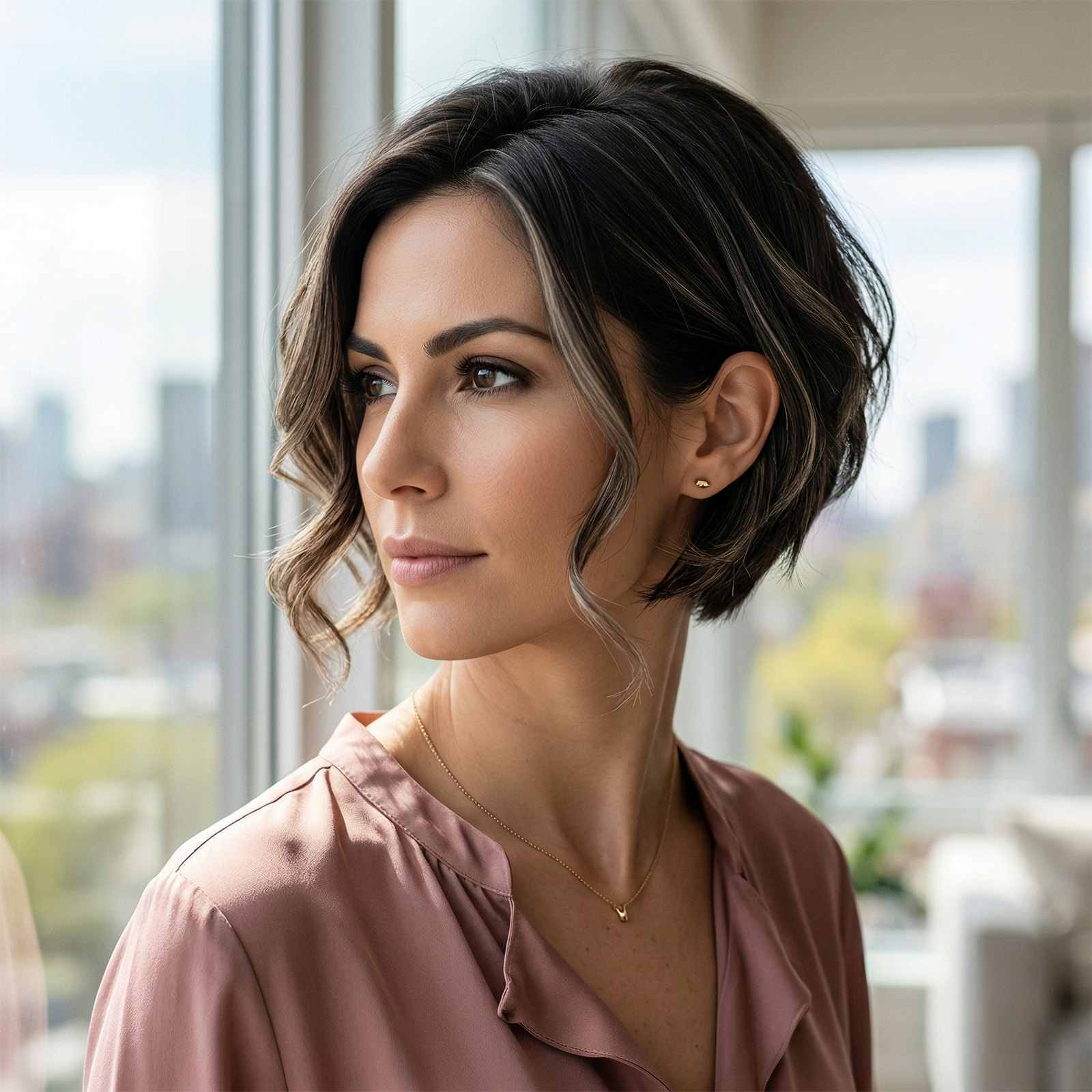 Ovaj stil predstavlja savršen spoj oštrih linija šišanja i mekoće koju donose uvojci. Kosa je pozadi kraća i geometrijski precizno oblikovana, ali su prednji dijelovi ostavljeni dugi i stilizovani u krupne, opuštene lokne. Rezultat je nježna i elegantna frizura koja odaje utisak žene koja vodi računa o svakom detalju svog izgleda.