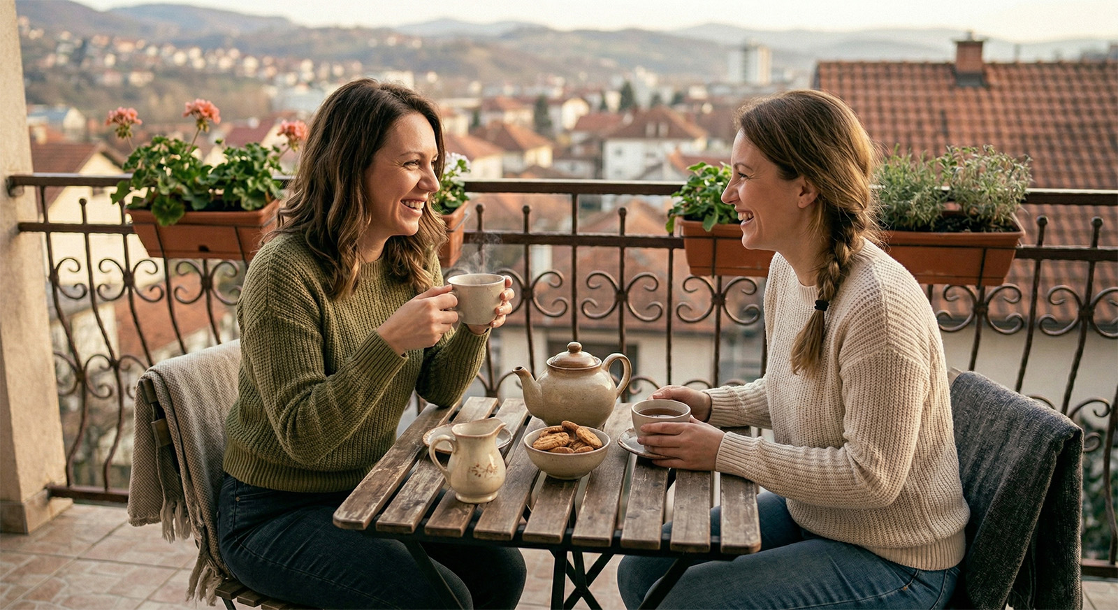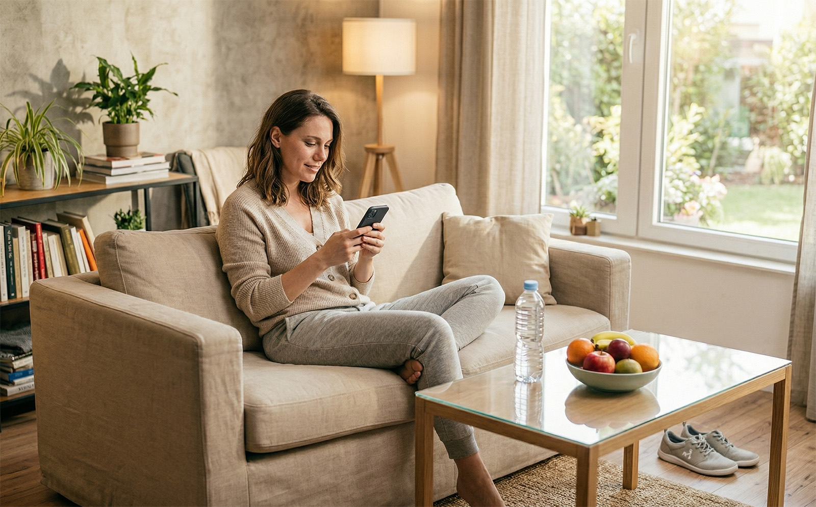 Nasmijana žena se odmara u dnevnom boravku prelistavajući sadržaj na telefonu, što je jedna od čestih svakodnevnih navika.