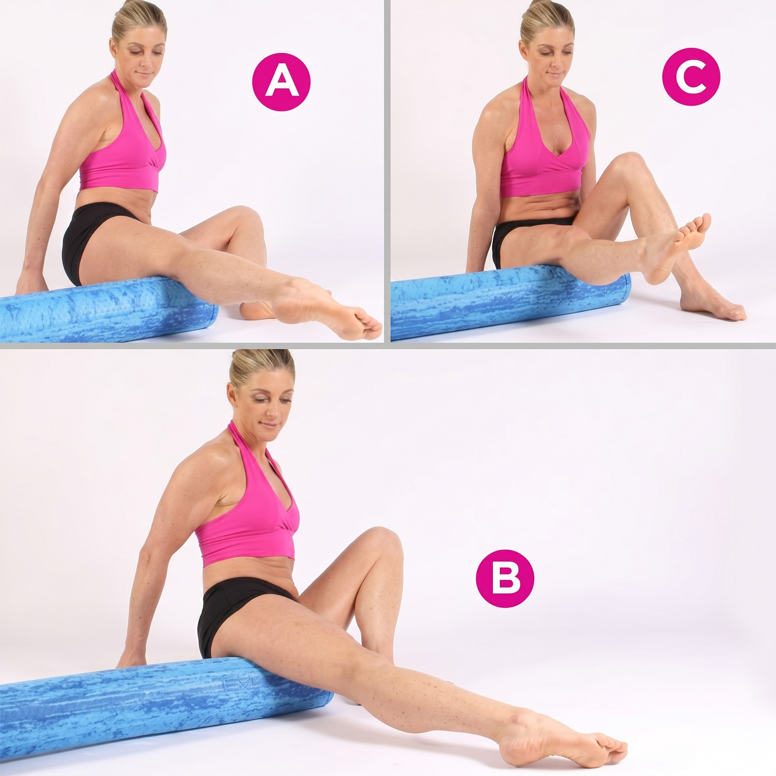 Sjedite na pod i desnu nogu zategnite prema naprijed tako što ćete se unutrašnjim dijelom butine osloniti na valjak (A). Zatim butinom što jače pritisnite valjak i povucite ga prema gornjem dijelu noge (B), a nožne prste okrenite prema unutra (C).
