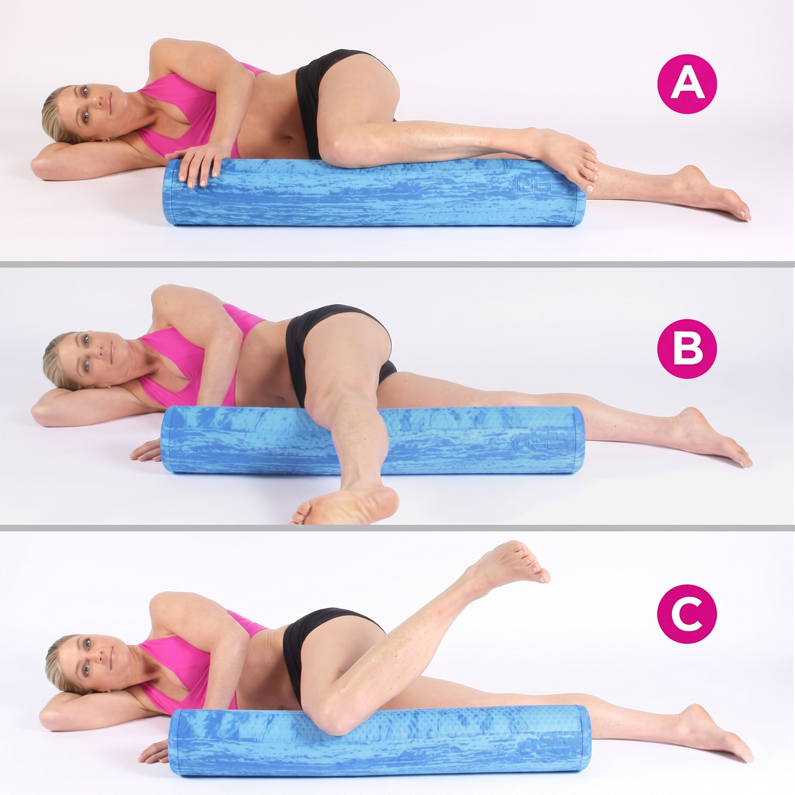 Lezite na desni bok i postavite valjak ispred sebe. Glavu oslonite na desnu ruku. Lijevu nogu postavite kao na slici (A). Zatim je lagano (ne podižući nogu sa valjka) ispružite ispred sebe (B).