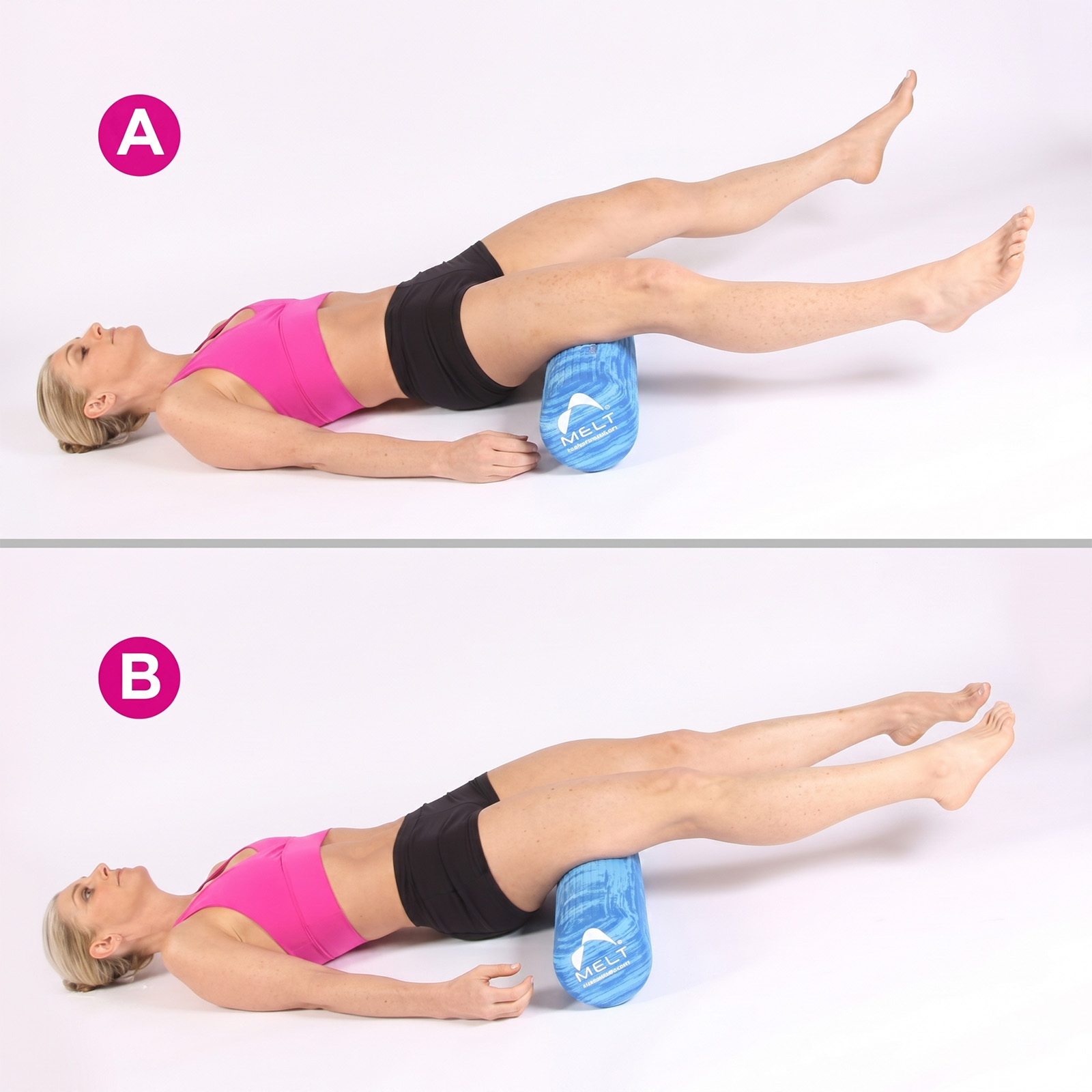 Lezite na leđa i postavite valjak ispod zadnjice, a noge ispružite i zategnite (A). Lagano spojite noge (B) pa ih raširite. Tokom izvođenja vježbe noge moraju biti potpuno priljubljene uz valjak. Uradite deset ponavljanja.