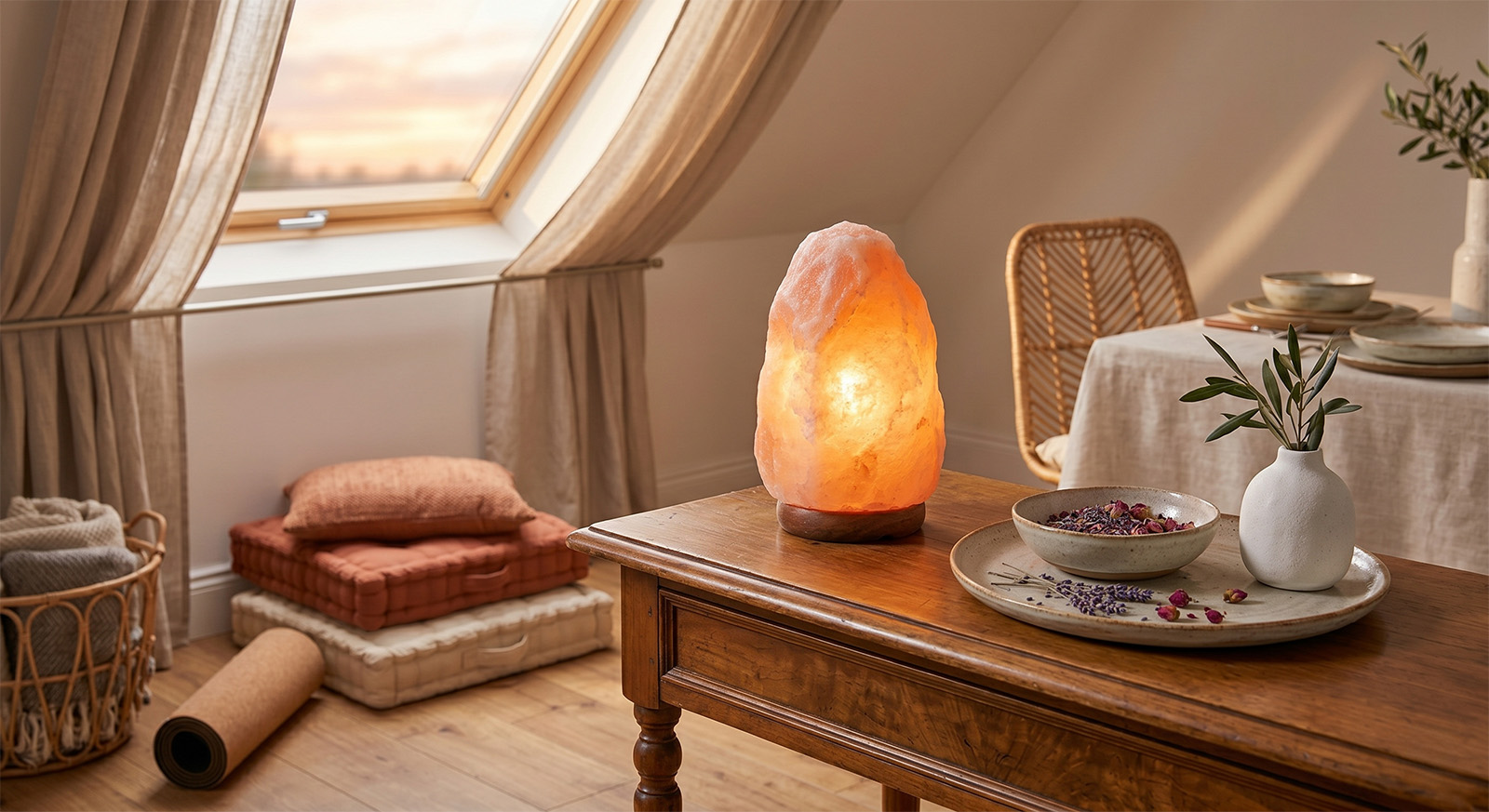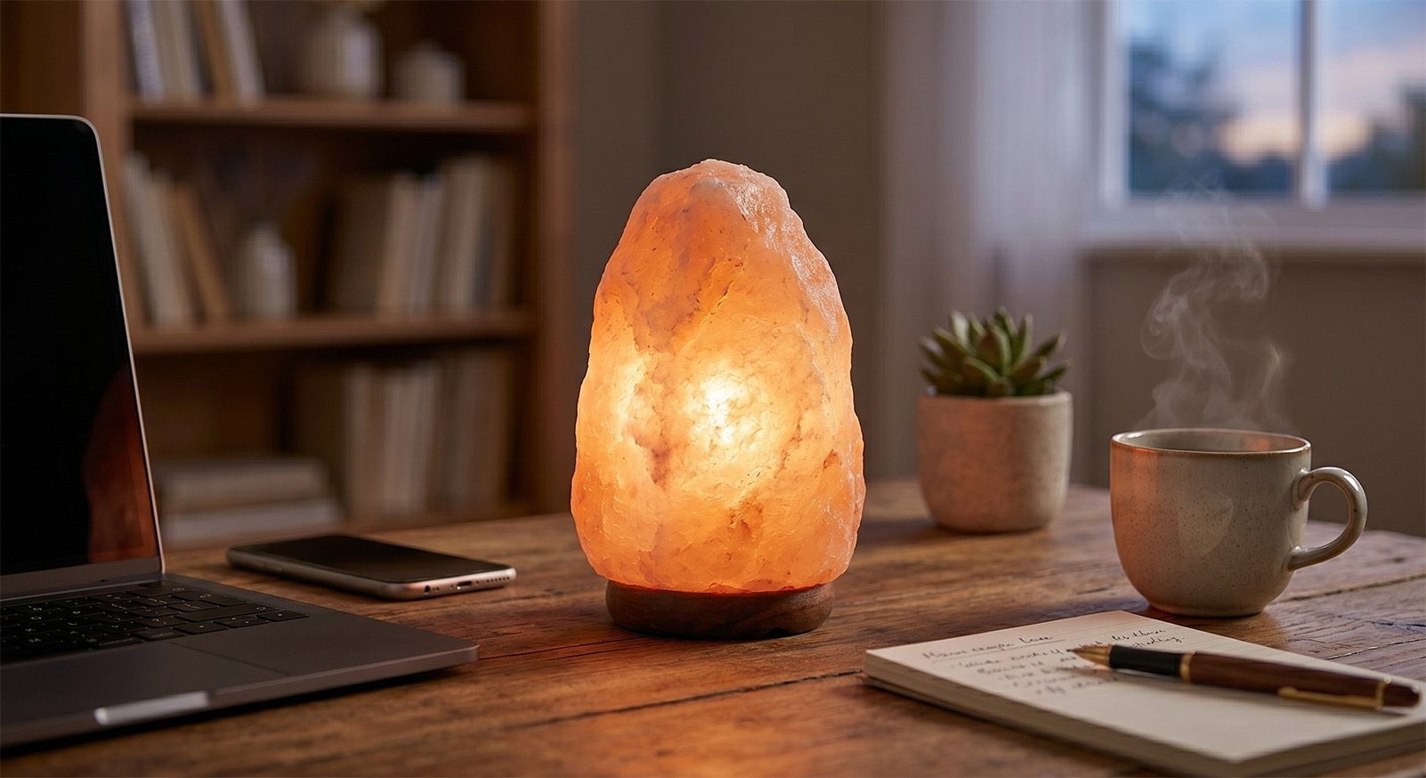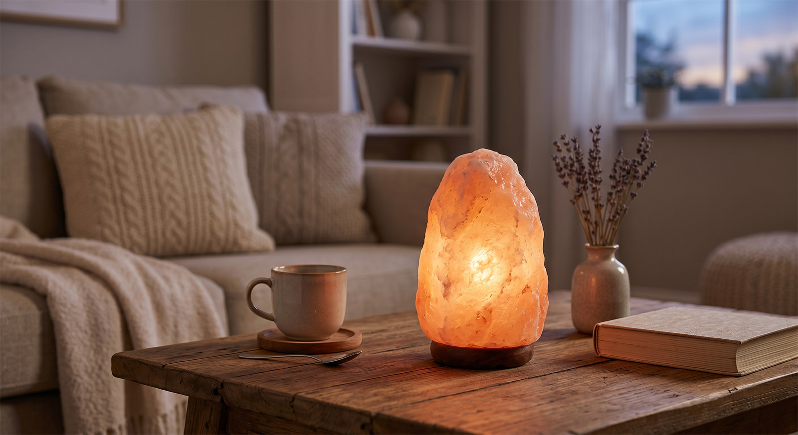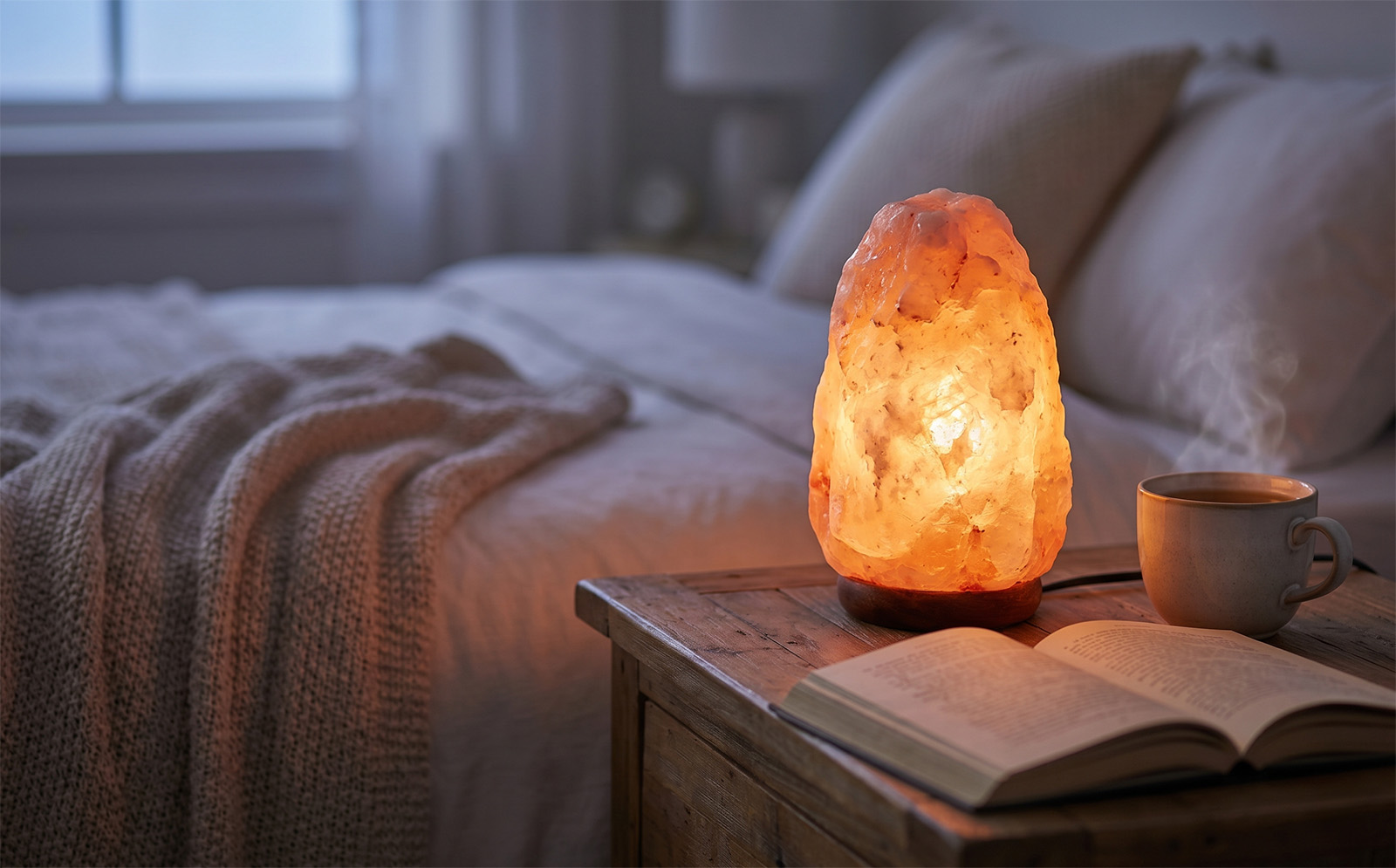 Upaljena lampa od himalajske soli na drvenom noćnom ormariću u spavaćoj sobi, pored otvorene knjige i šolje toplog čaja.